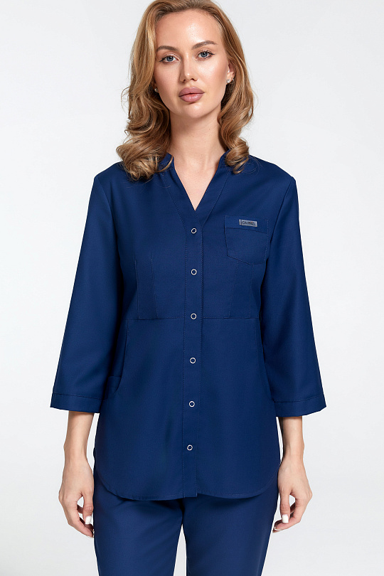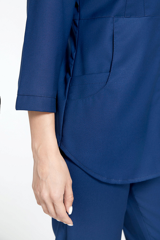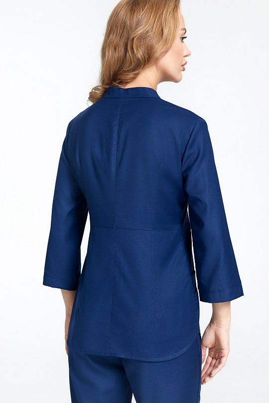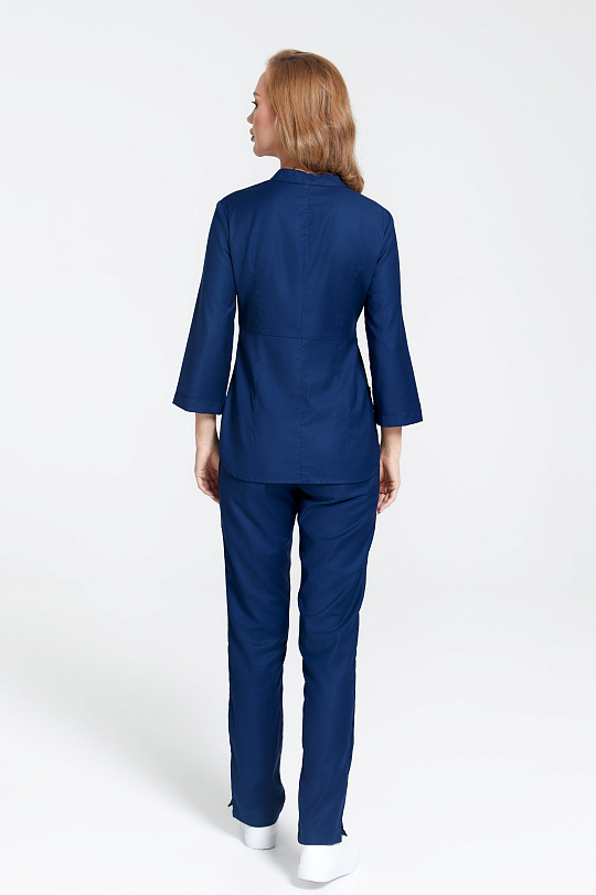 Куртка женская, медицинская, хирургическая, полуприлегающего силуэта, отрезная по линии талии, воротник стойка. Перед с отрезной планкой, застегивающейся на 6 кнопок, боковыми карманами, расположенными в фигурных швах полочек, и малым правым карманом. От линии талии по две вытачки. На левой полочке нагрудный карман с притачной планкой. Спинка со средним швом и талиевыми вытачками. Рукава втачные, одношовные, имеют две длинны :короткий, с притачной манжетой и рукав ¾ с притачной манжетой Куртка выпускается в комплекте с брюками, допускается изготовление отдельными предметами.