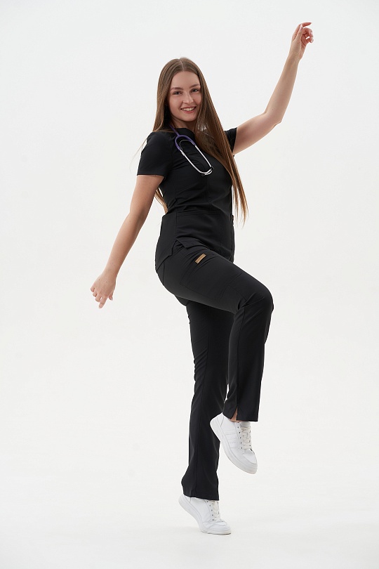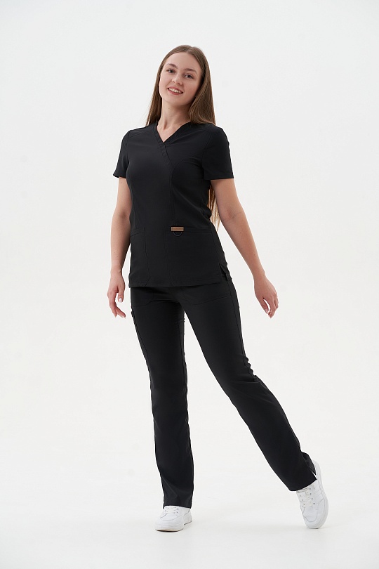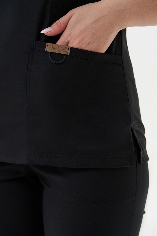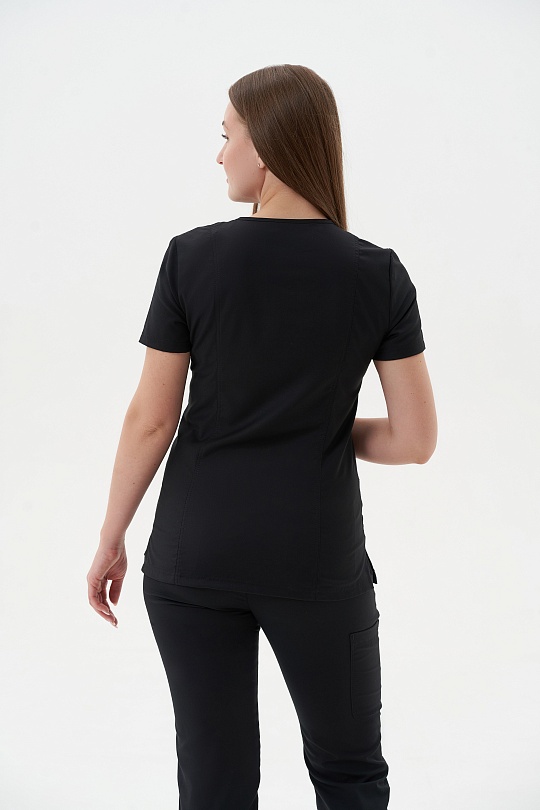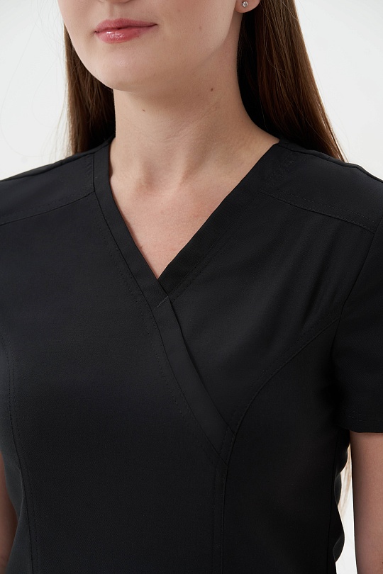 Медицинский топ с V-образным вырезом на запах. Полуприлегающий крой, вертикальные рельефы по переду и спинке в этой модели создадут идеальный силуэт. Горловина с узкими аккуратными планками, они же дублируются на вместительных карманах. Правый карман с ""секретом"", за ним прячется элемент из эластичной тесьмы с закрепками по бокам и центру, что позволит закрепить необходимые мелочи и не терять их. На левом кармане - наружная петля из шляпной резинки в тон материала и настрочной лейбл бренда. Отрезные кокетки, горловина и рельефы с двойной отстрочкой.