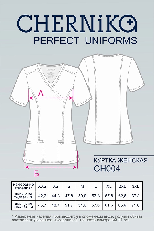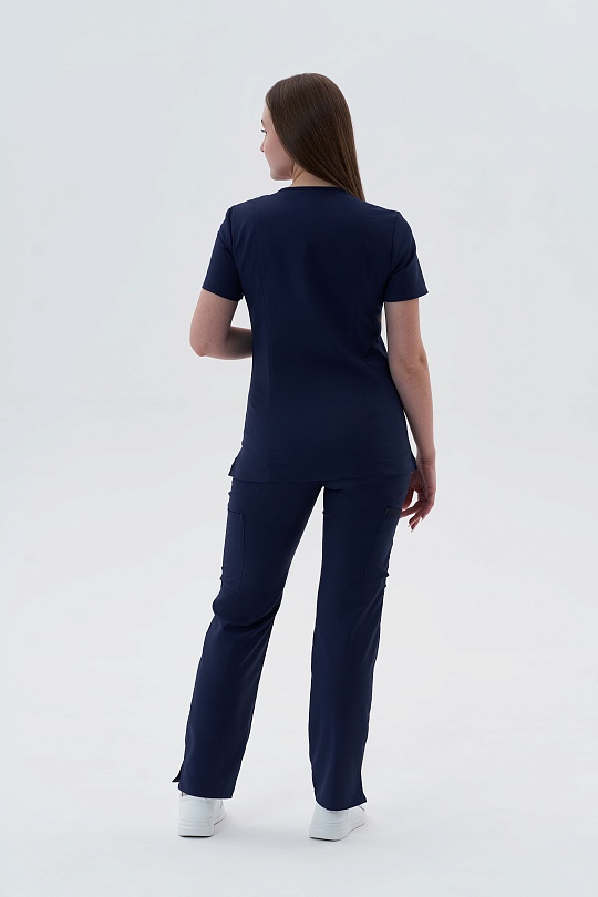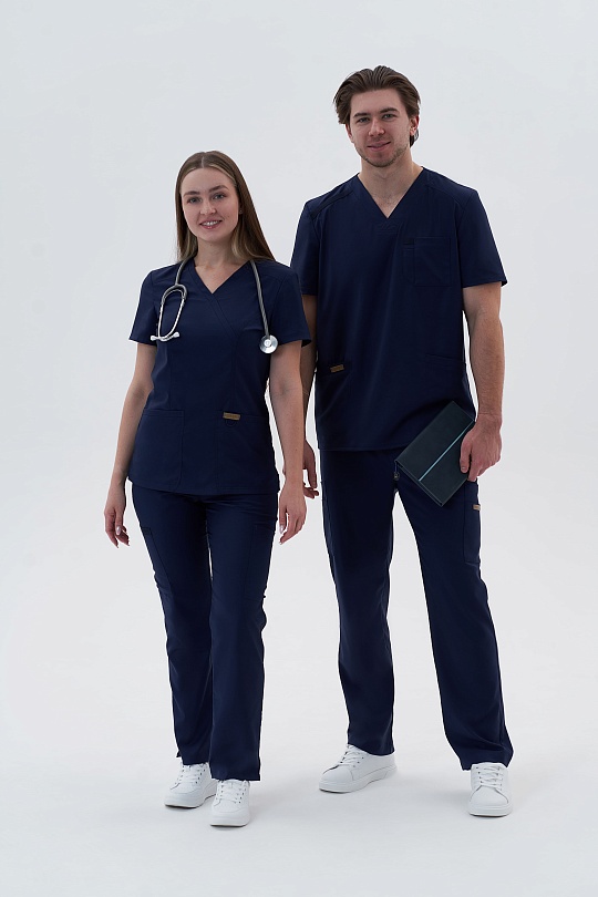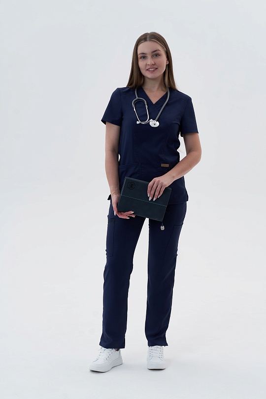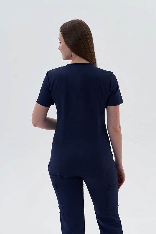Медицинский топ с V-образным вырезом на запах. Полуприлегающий крой, вертикальные рельефы по переду и спинке в этой модели создадут идеальный силуэт. Горловина с узкими аккуратными планками, они же дублируются на вместительных карманах. Правый карман с ""секретом"", за ним прячется элемент из эластичной тесьмы с закрепками по бокам и центру, что позволит закрепить необходимые мелочи и не терять их. На левом кармане - наружняя петля из шляпной резинки в тон материала и настрочной лейбл бренда. Отрезные кокетки, горловина и рельефы с двойной отстрочкой.
