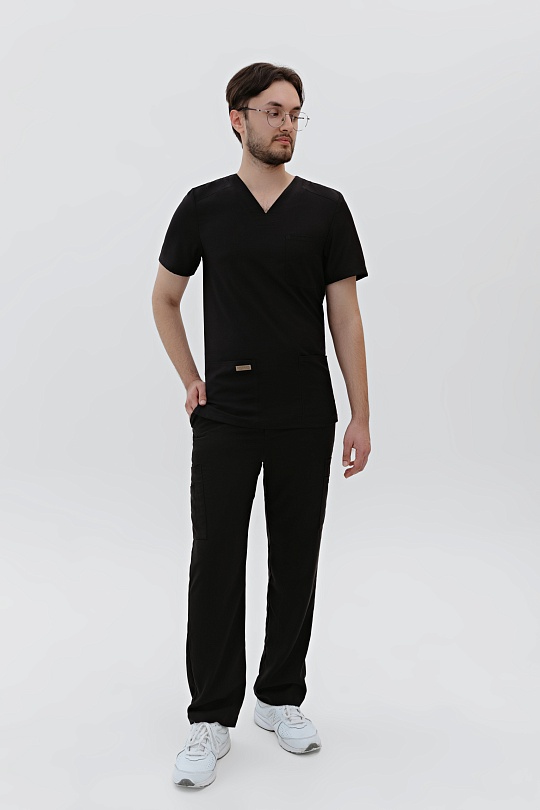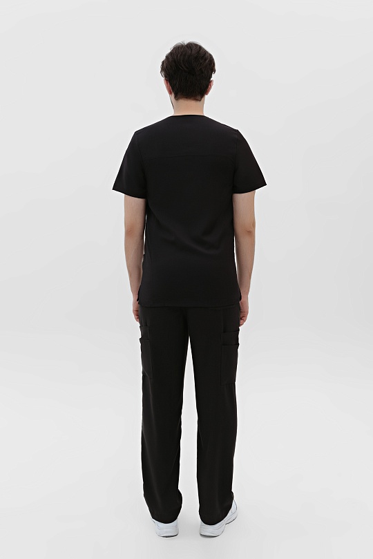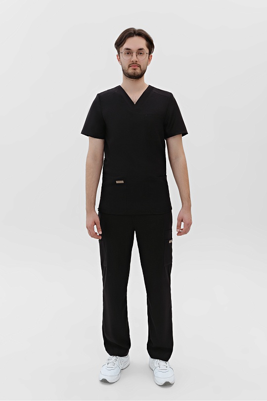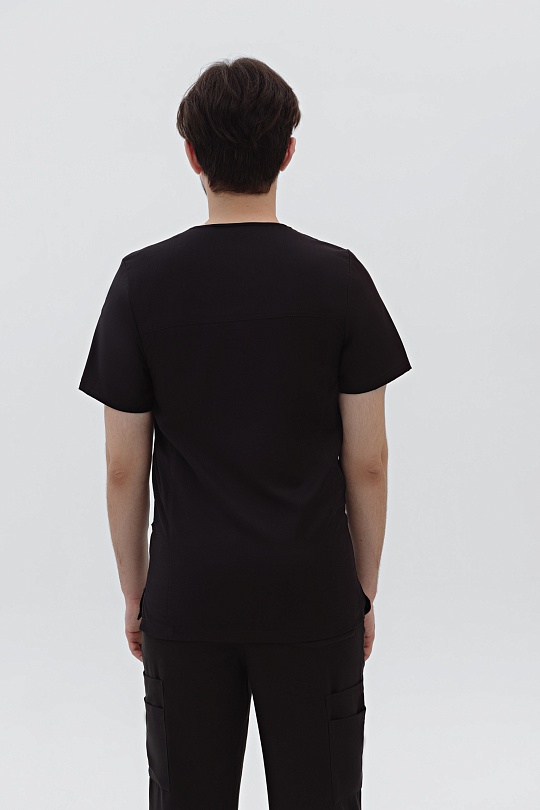 Классическая мужская хирургическая куртка с акцентом на функциональность. Крой свободный, необлегающий, разрезы в боковых швах для дополнительного комфорта. Треугольной вырез горловины с широкими планками и трапецевидной вставкой. Три вместительных кармана: нагрудный содержит отделение для авторучки и два широких, объемных кармана по низу изделия. Спинка с прямой кокеткой и вертикальными швами, которые структурируют силуэт, подчёркивают в нём уверенность и твёрдость. Большое количество двойных отстрочек отсылает к актуальной джинсовой эстетике.