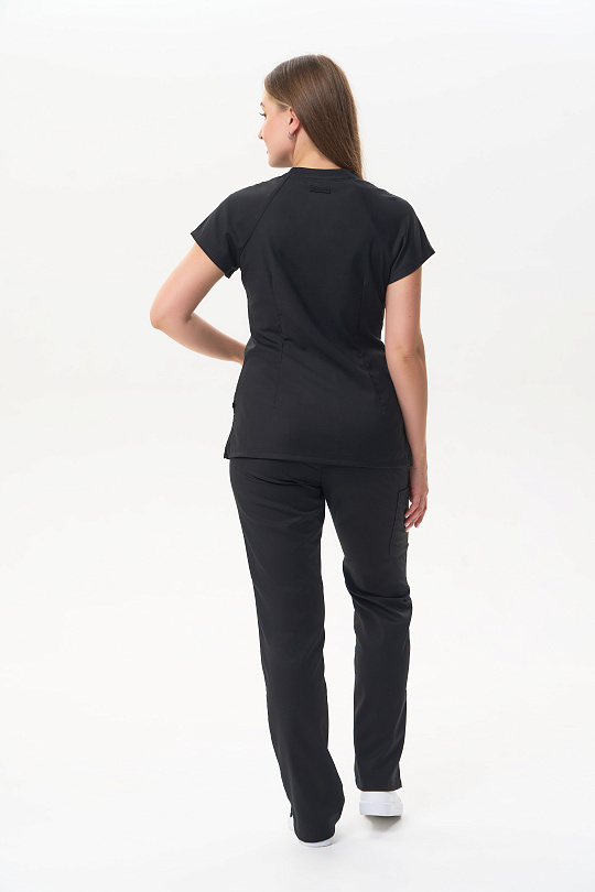 Куртка женская, п/прилегающего силуэта, без застежки, с разрезами в боковых швах. Куртка без воротника с V-образной горловиной с планками. Полочка с боковыми накладными карманами фигурной формы. Спинка с талевыми вытачками. Рукав реглан, короткий. Горловина спинки и полочки с планкой из рибаны, по левому внутреннему боковому карману также планка из рибаны.