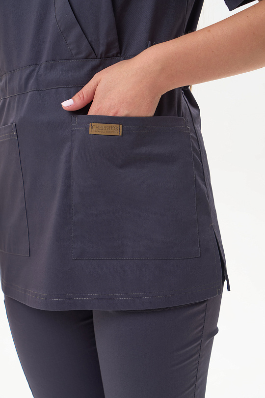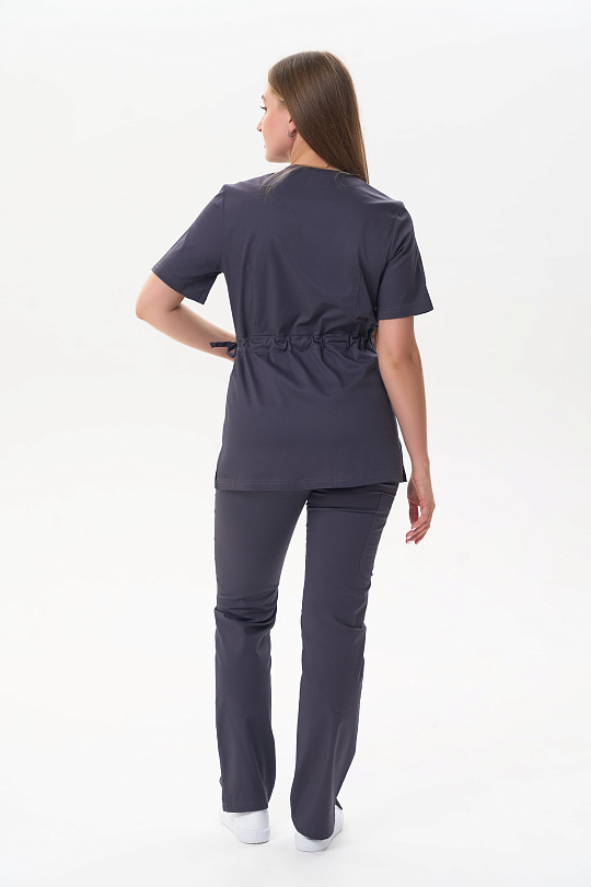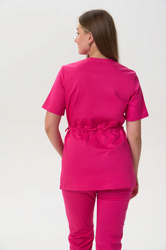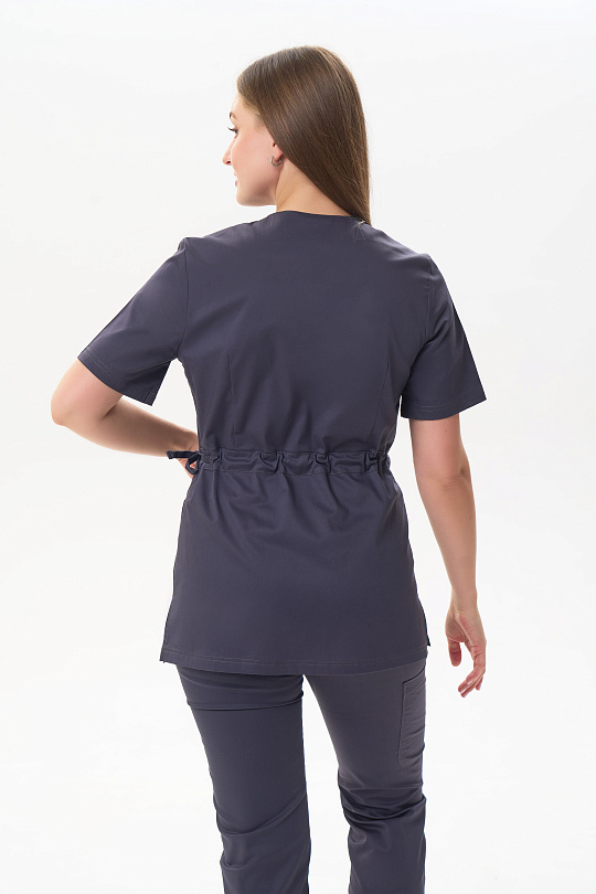 Куртка женская прямого силуэта без застёжки. Горловина обработана планкой, по низу боковых швов разрезы. Отрезная по линии талии с кулиской. Полочка с защипом в шве талии, в нижней части полочки настрочены накладные карманы. Спинка с талиевыми вытачками в верхней части. Рукава втачные, одношовные. короткие.