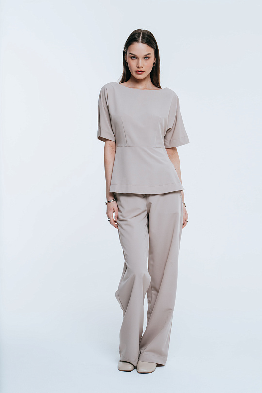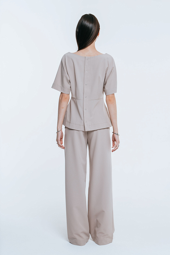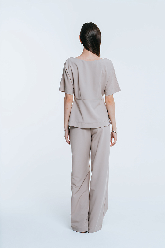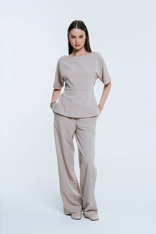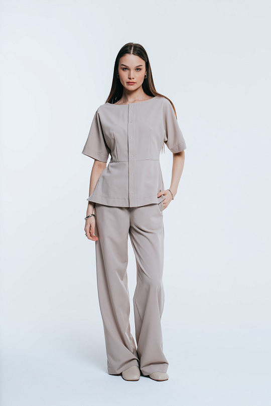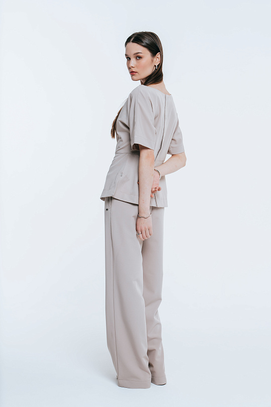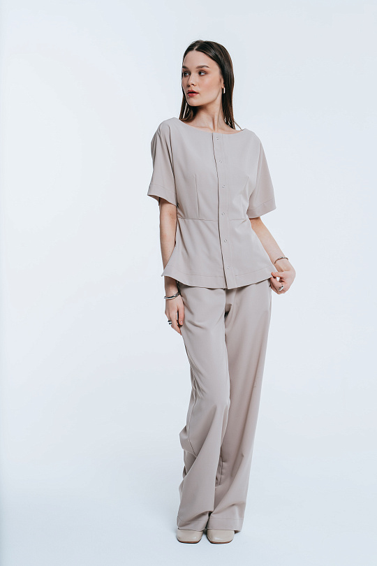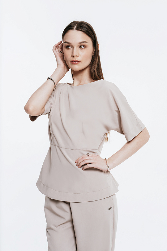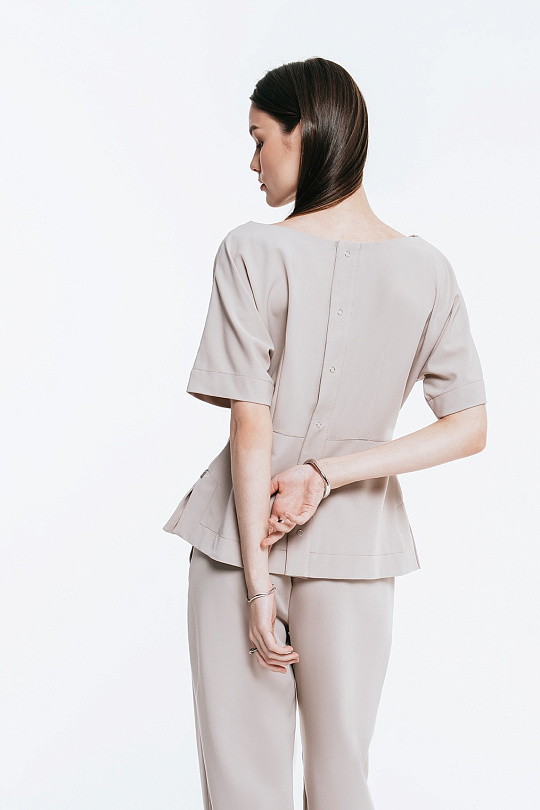 Куртка женская полуприлегающего силуэта, с разрезами в боковых швах. Полочка с подрезом по линии талии, нагрудными вытачками от подреза до центра груди. Спинка распашная с отрезными планками и подрезом по линии талии. От подреза расположены талиевые вытачки. Застежка на металлические кнопки расположенные на отрезной планке. Рукава цельнокроенные, короткие. Куртка без воротника, вырез «лодочка».