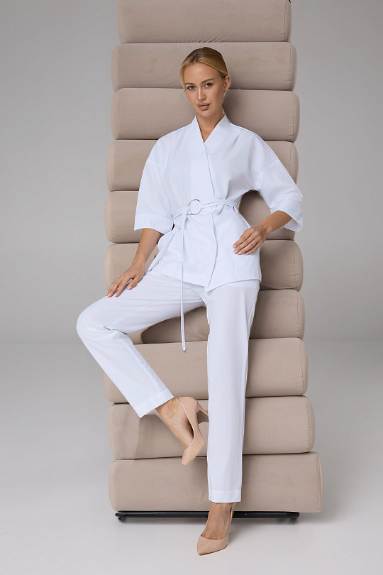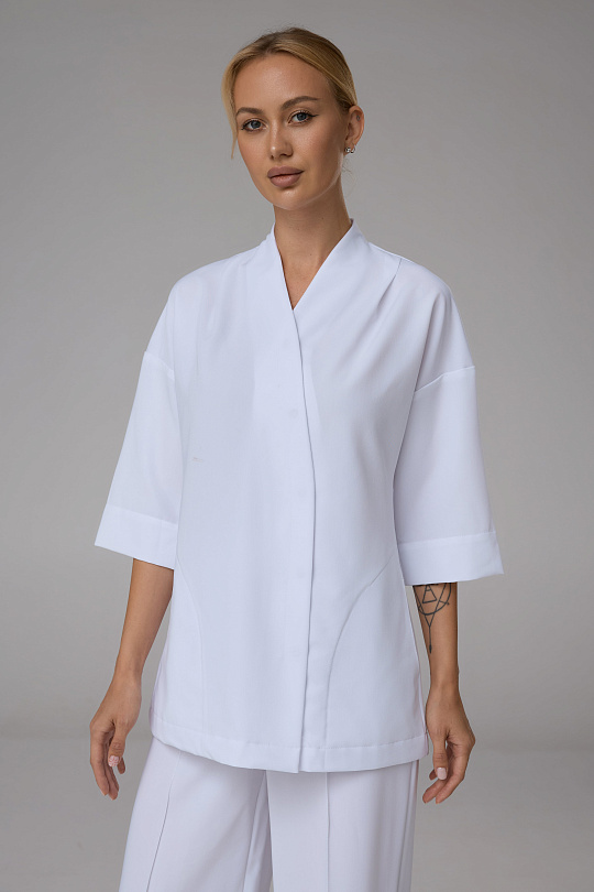 Куртка женская, прямого силуэта, с рукавом кимано, с фигурной линией борта переходящей в стойку, с застежкой на 5 потайных кнопок. Полочка со складками из плеча, с карманами в боковых швах. Спинка со складками по линии талии. Ширина по талии регулируется съёмным поясом с декоративным элементом. Рукава имеют длину ¾.