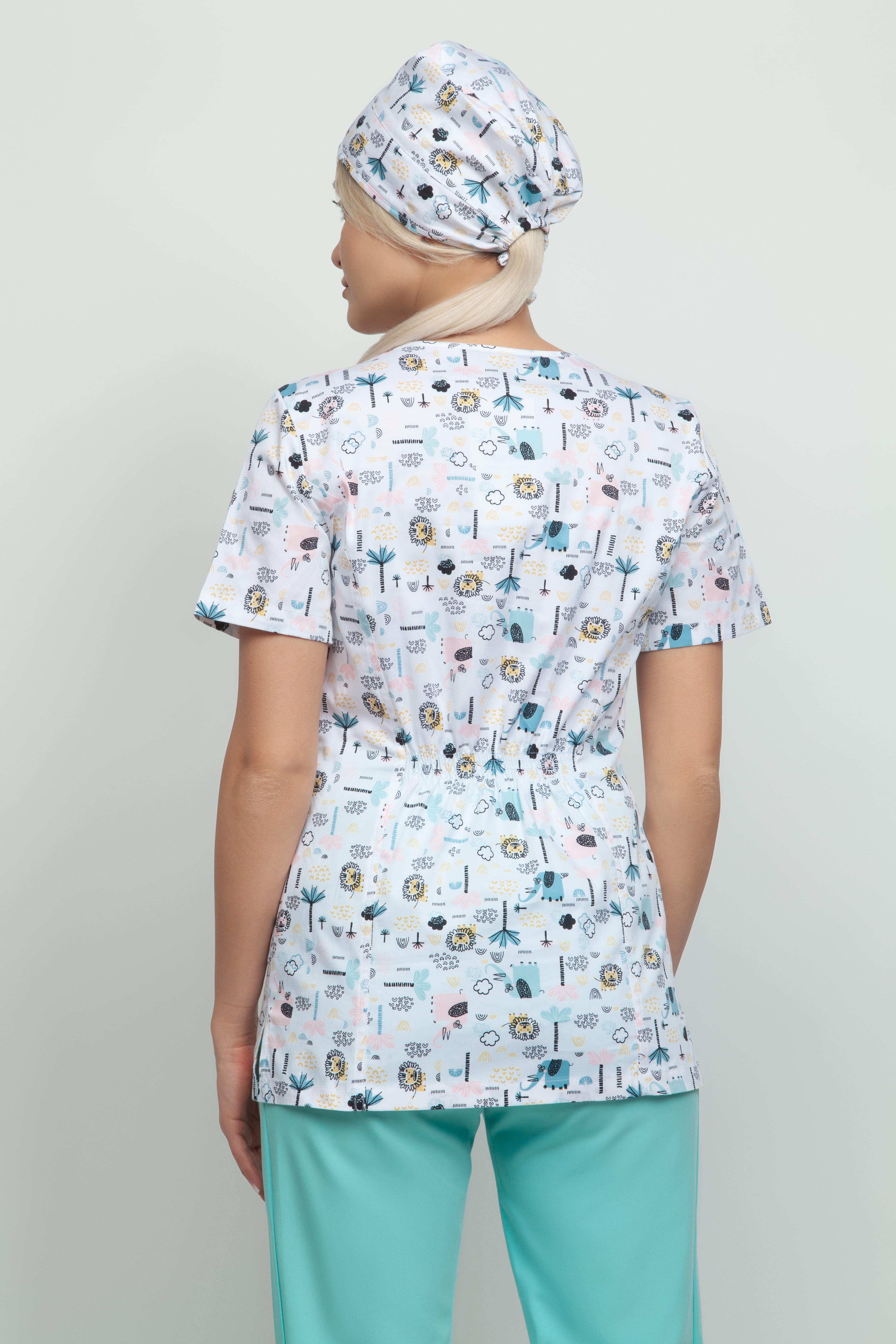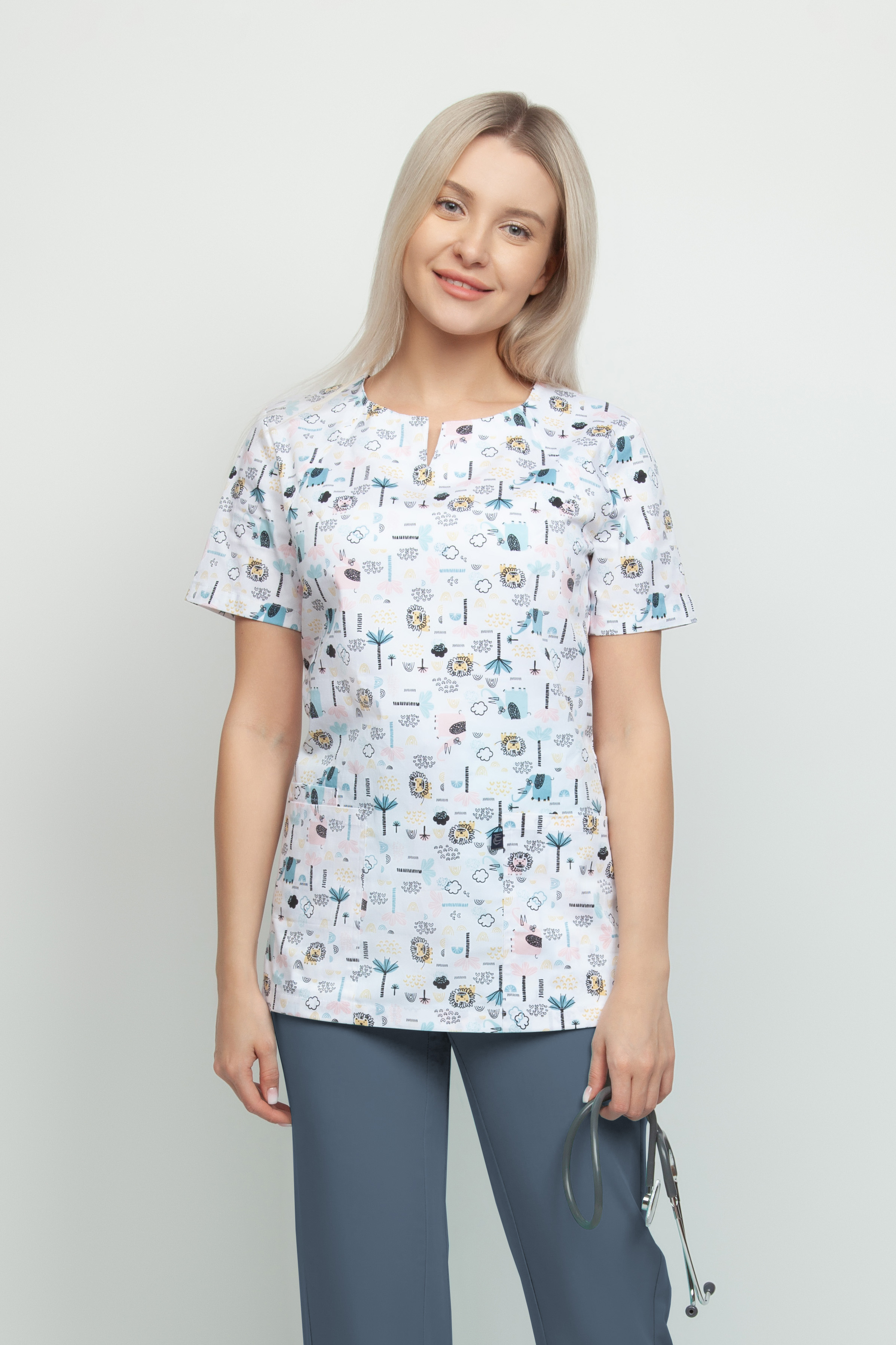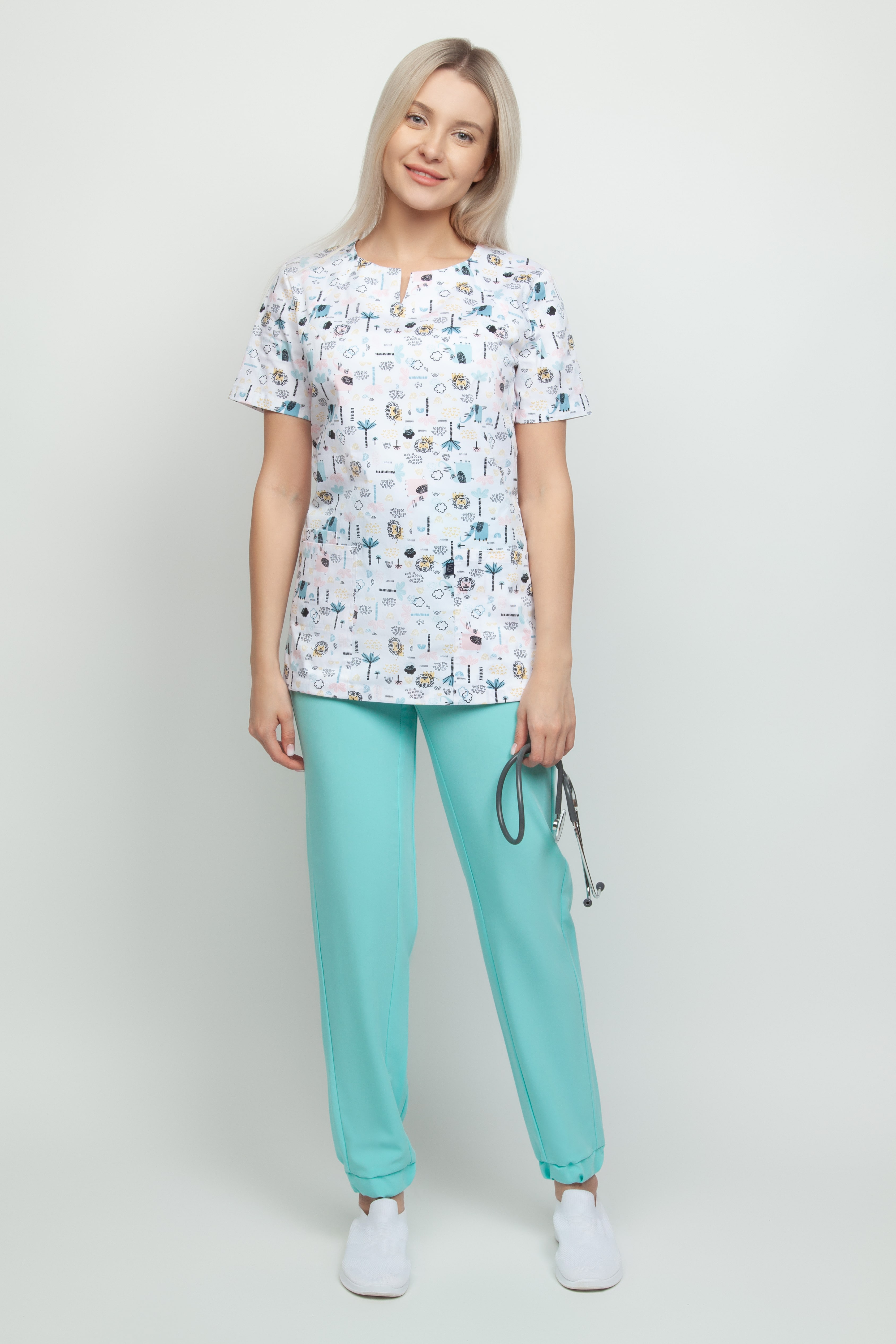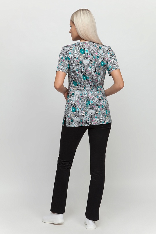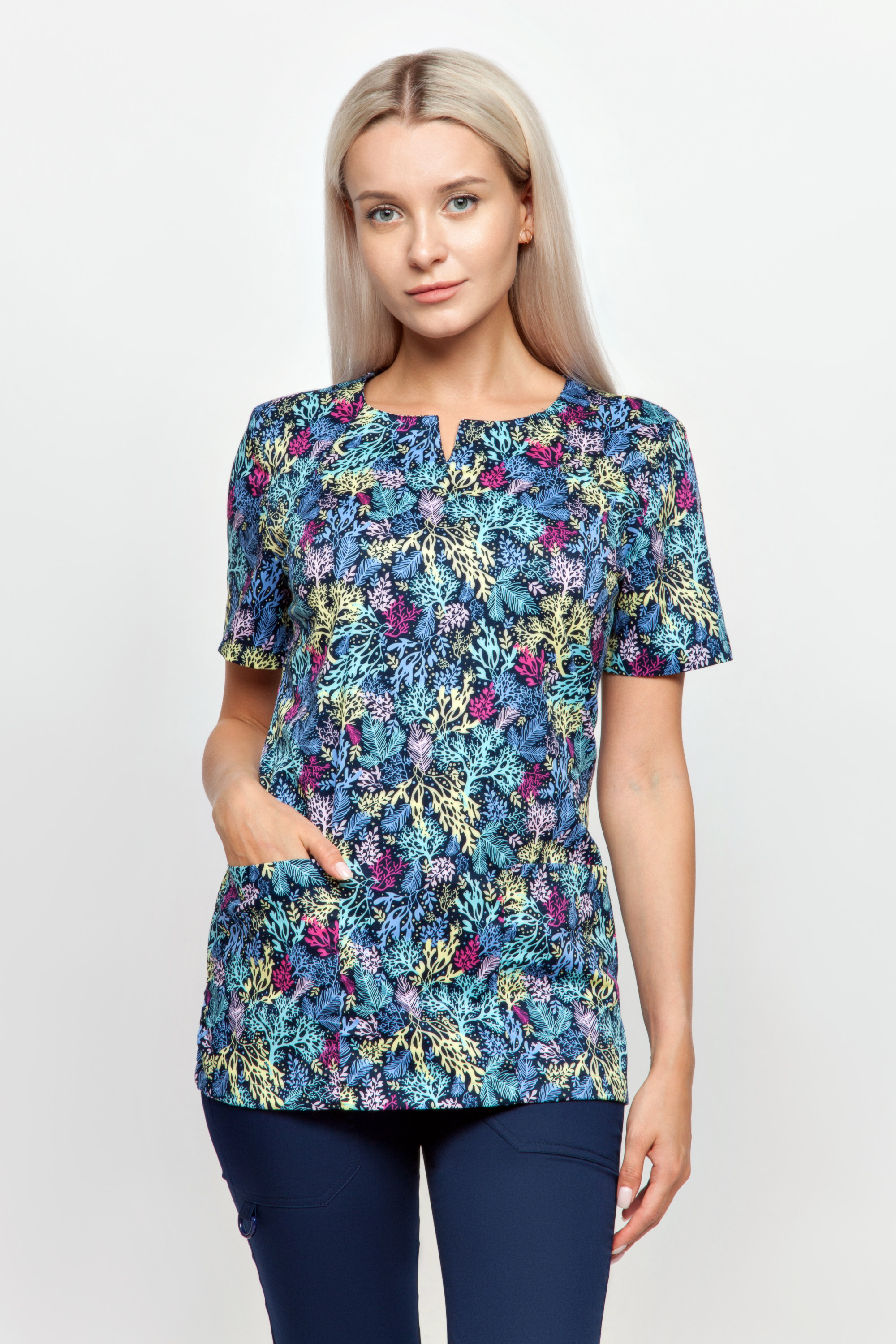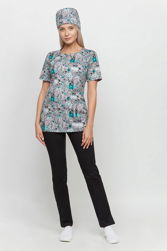 Куртка женская медицинская, хирургическая, прямого силуэта, без воротника и застежки, с разрезами в боковых швах. Перед с фигурной кокеткой, накладными нижними боковыми карманами, нагрудной выточкой, выходящей из кокетки. На правой стороне над карманом, расположен малый карман. Горловина закругленная с фигурным вырезом и отделочными строчками. Спинка с рельефными швами выходящими из проймы до низа. На центральной части спинки по линии талии на многоигольной с/машине проложены четыре строчки ниткой-резинкой Рукава втачные, одношовные, короткие.