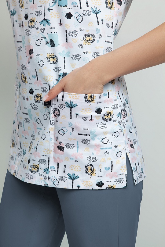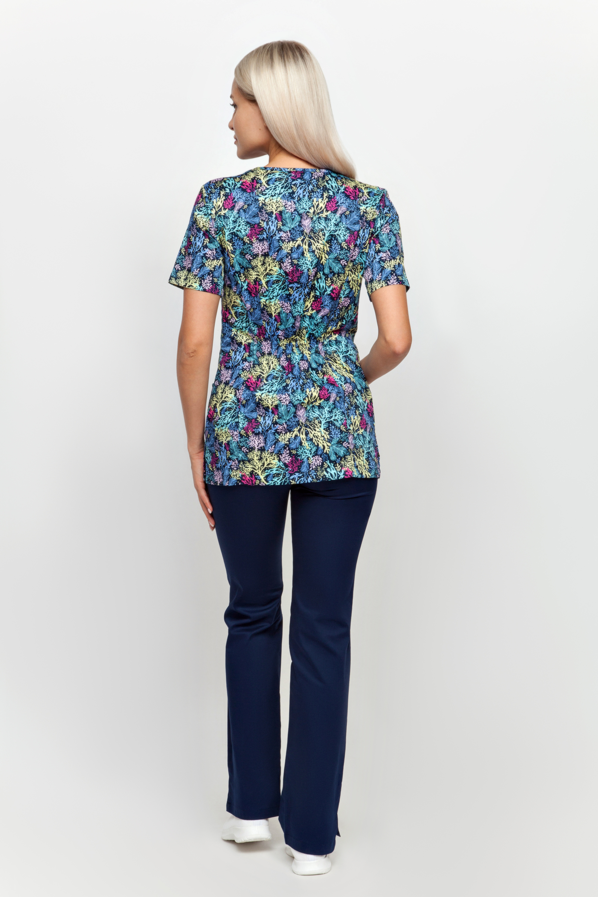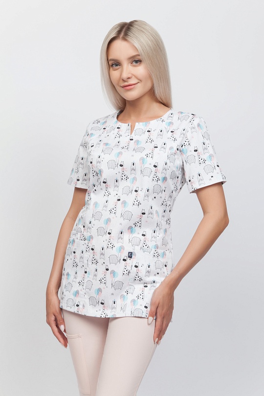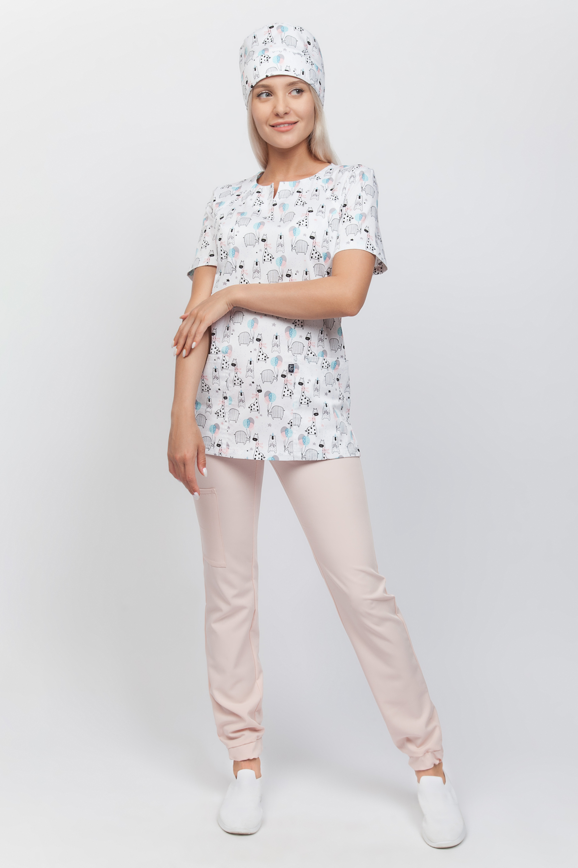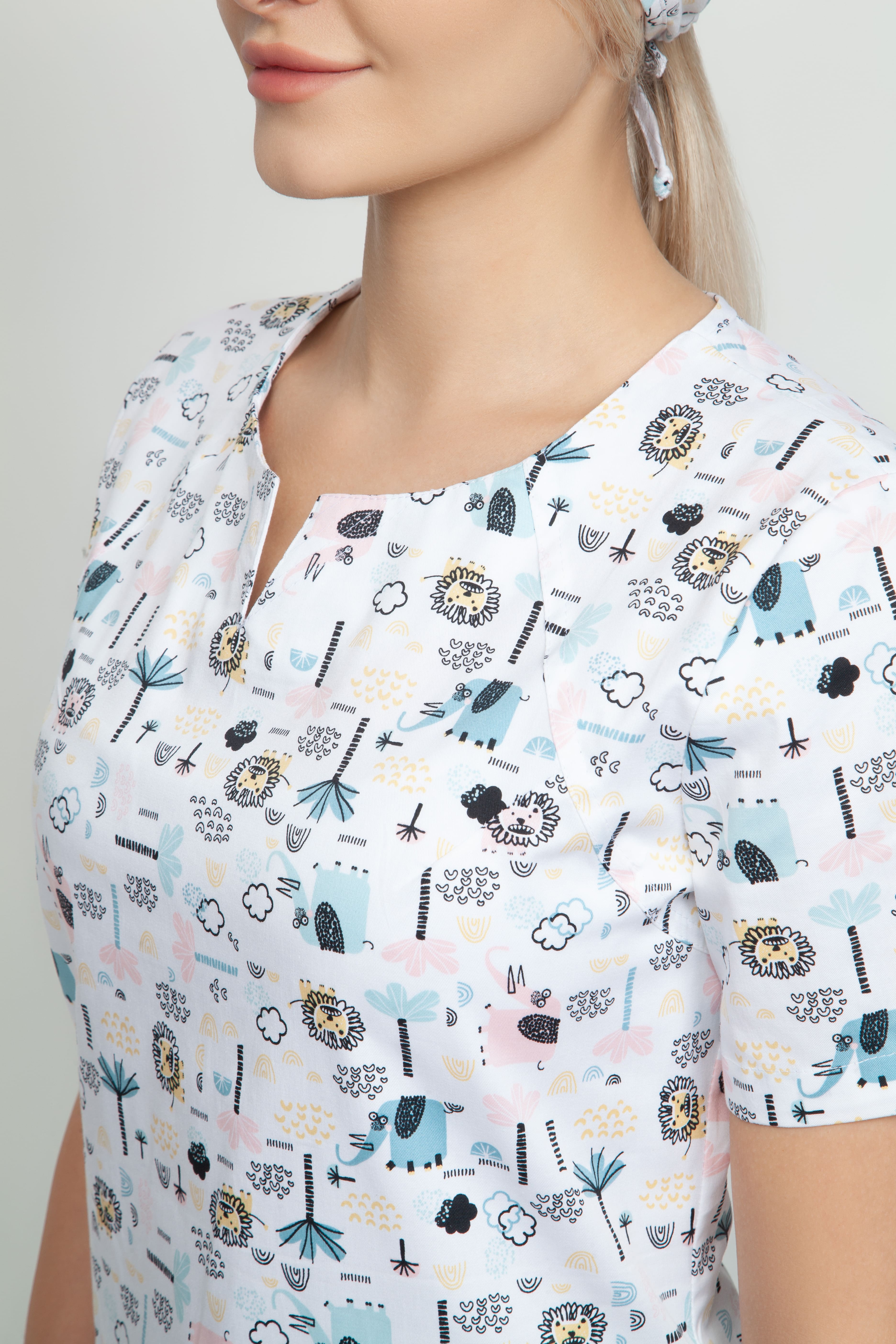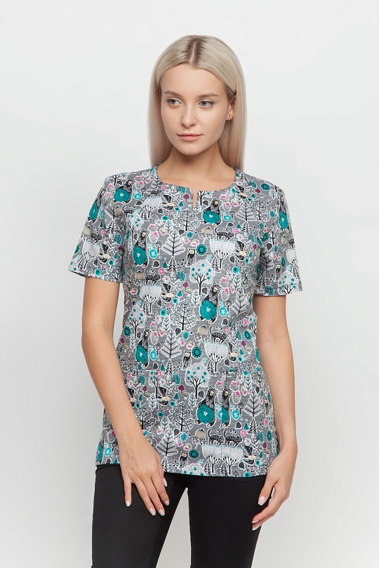 Куртка женская медицинская, хирургическая, прямого силуэта, без воротника и застежки, с разрезами в боковых швах. Перед с фигурной кокеткой, накладными нижними боковыми карманами, нагрудной выточкой, выходящей из кокетки. На правой стороне над карманом, расположен малый карман. Горловина закругленная с фигурным вырезом и отделочными строчками. Спинка с рельефными швами выходящими из проймы до низа. На центральной части спинки по линии талии на многоигольной с/машине проложены четыре строчки ниткой-резинкой Рукава втачные, одношовные, короткие.