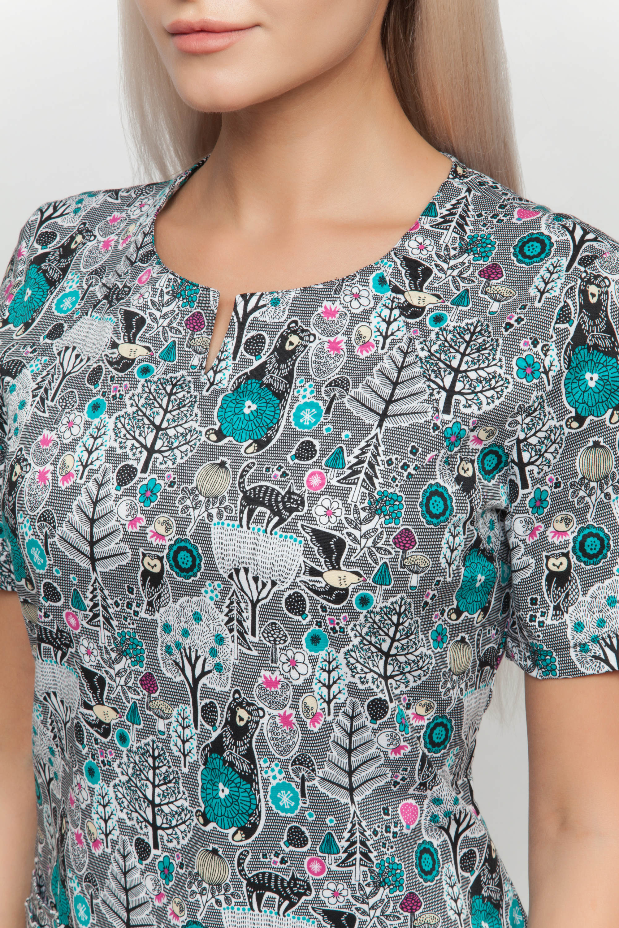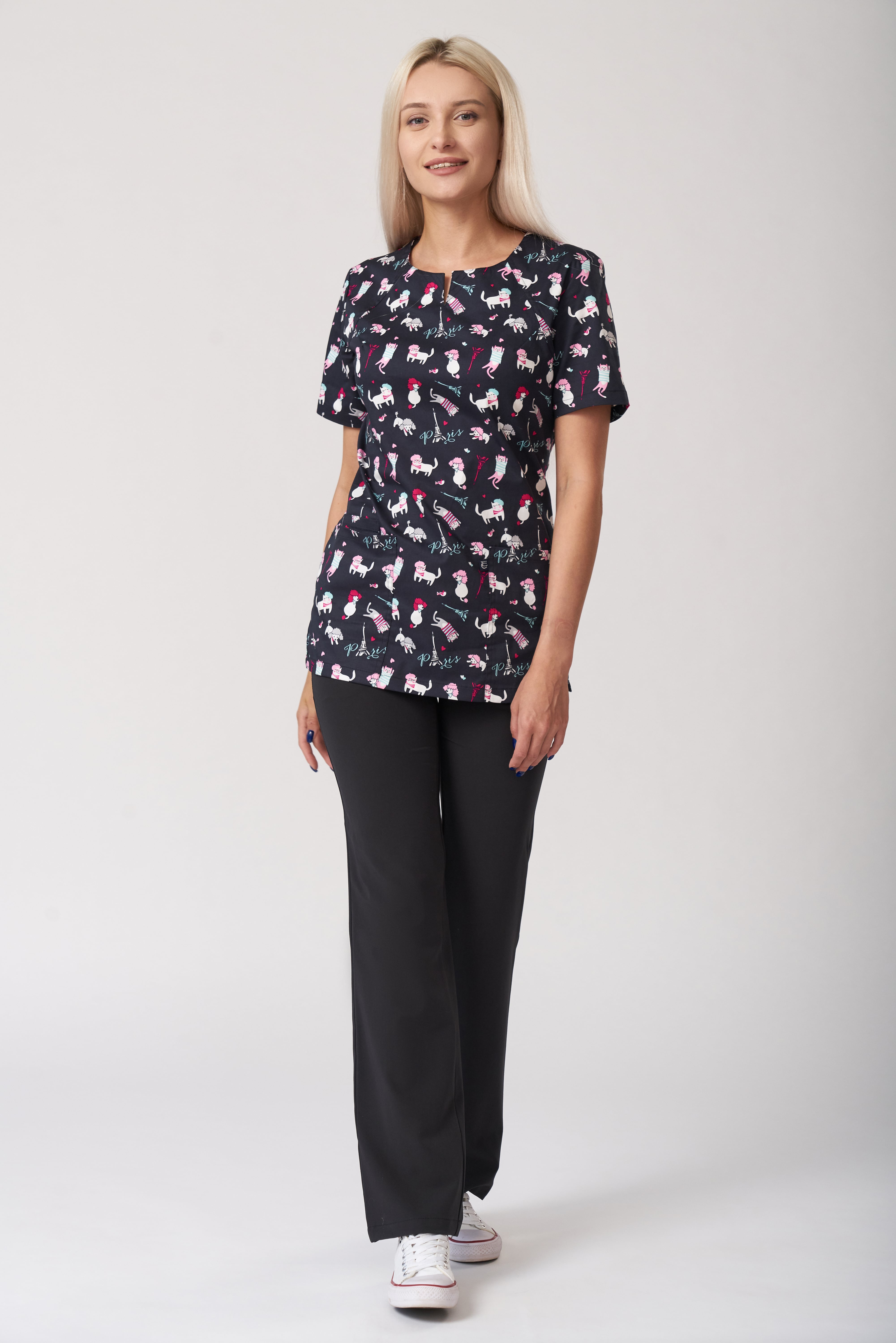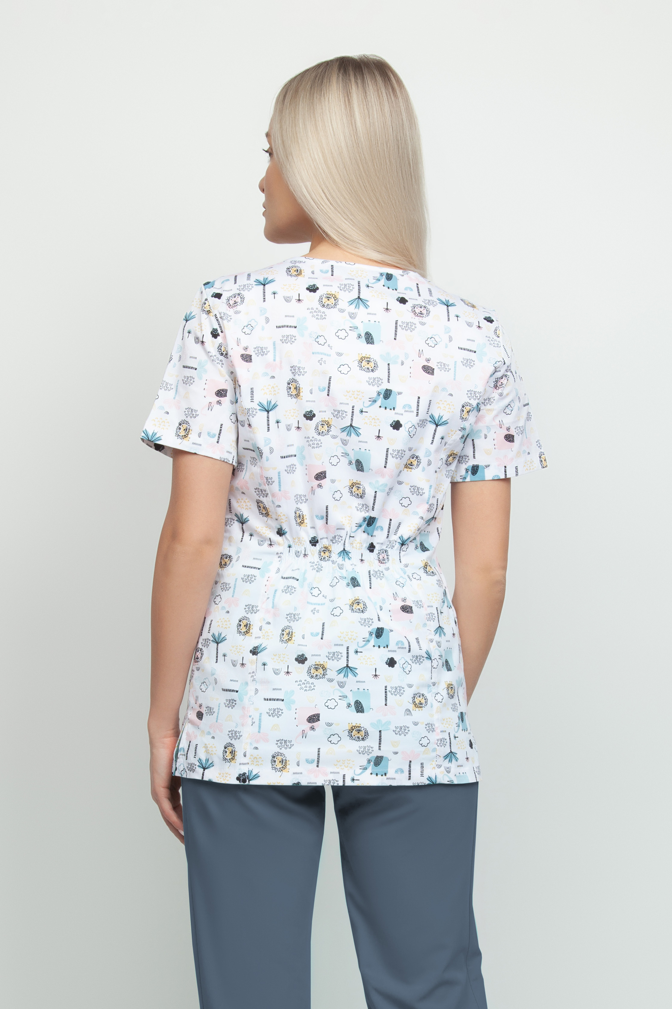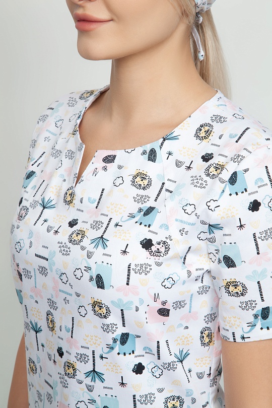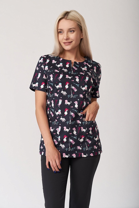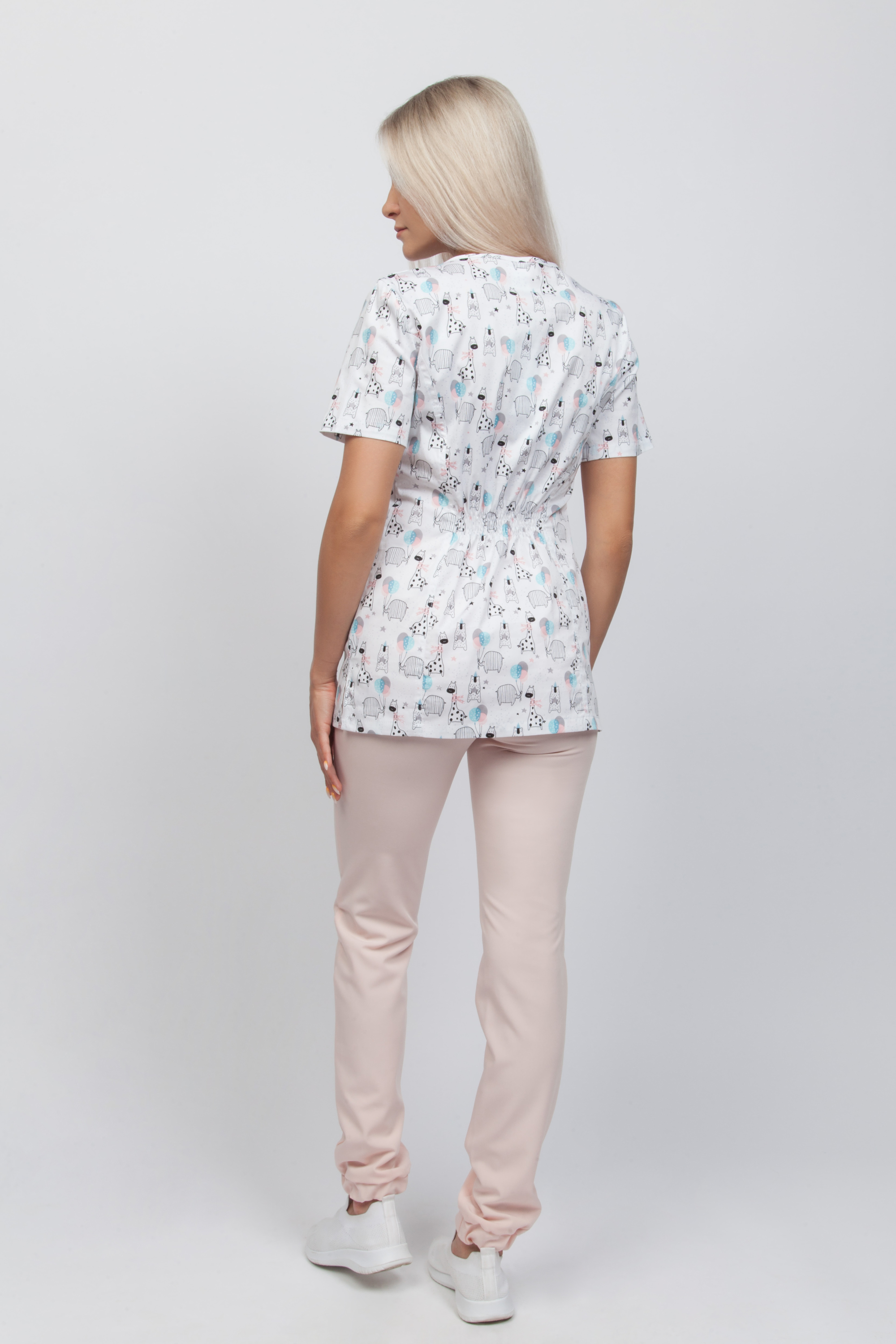 Куртка женская медицинская, хирургическая, прямого силуэта, без воротника и застежки, с разрезами в боковых швах. Перед с фигурной кокеткой, накладными нижними боковыми карманами, нагрудной выточкой, выходящей из кокетки. На правой стороне над карманом, расположен малый карман. Горловина закругленная с фигурным вырезом и отделочными строчками. Спинка с рельефными швами выходящими из проймы до низа. На центральной части спинки по линии талии на многоигольной с/машине проложены четыре строчки ниткой-резинкой Рукава втачные, одношовные, короткие.