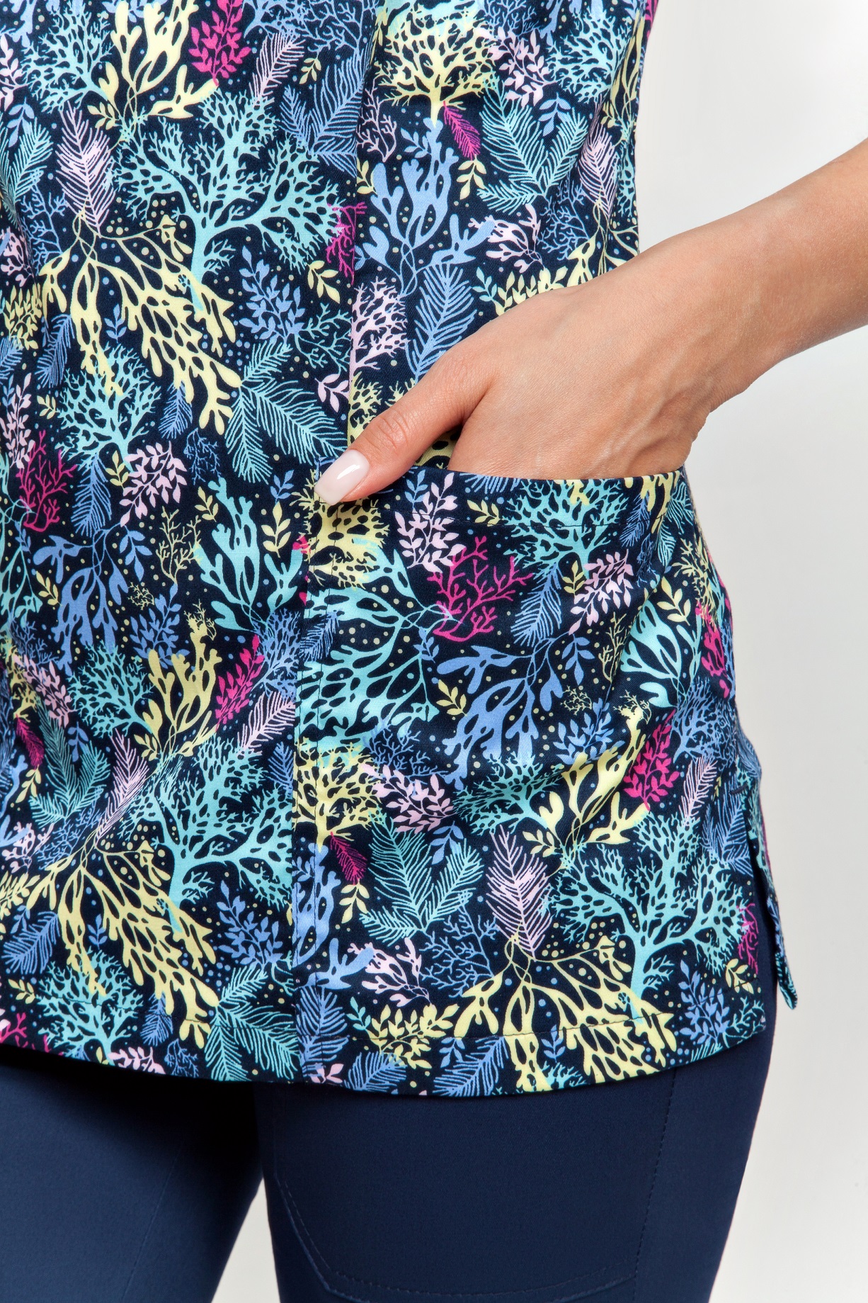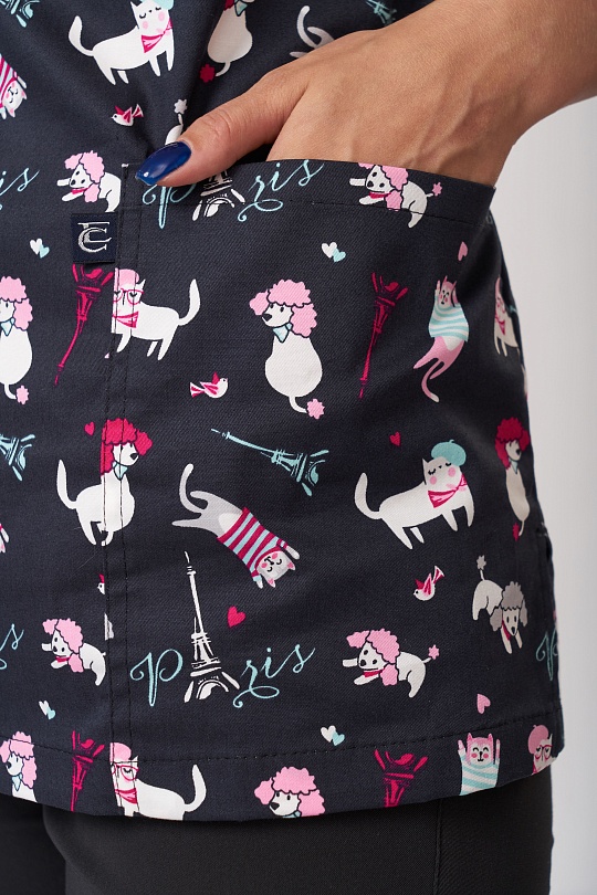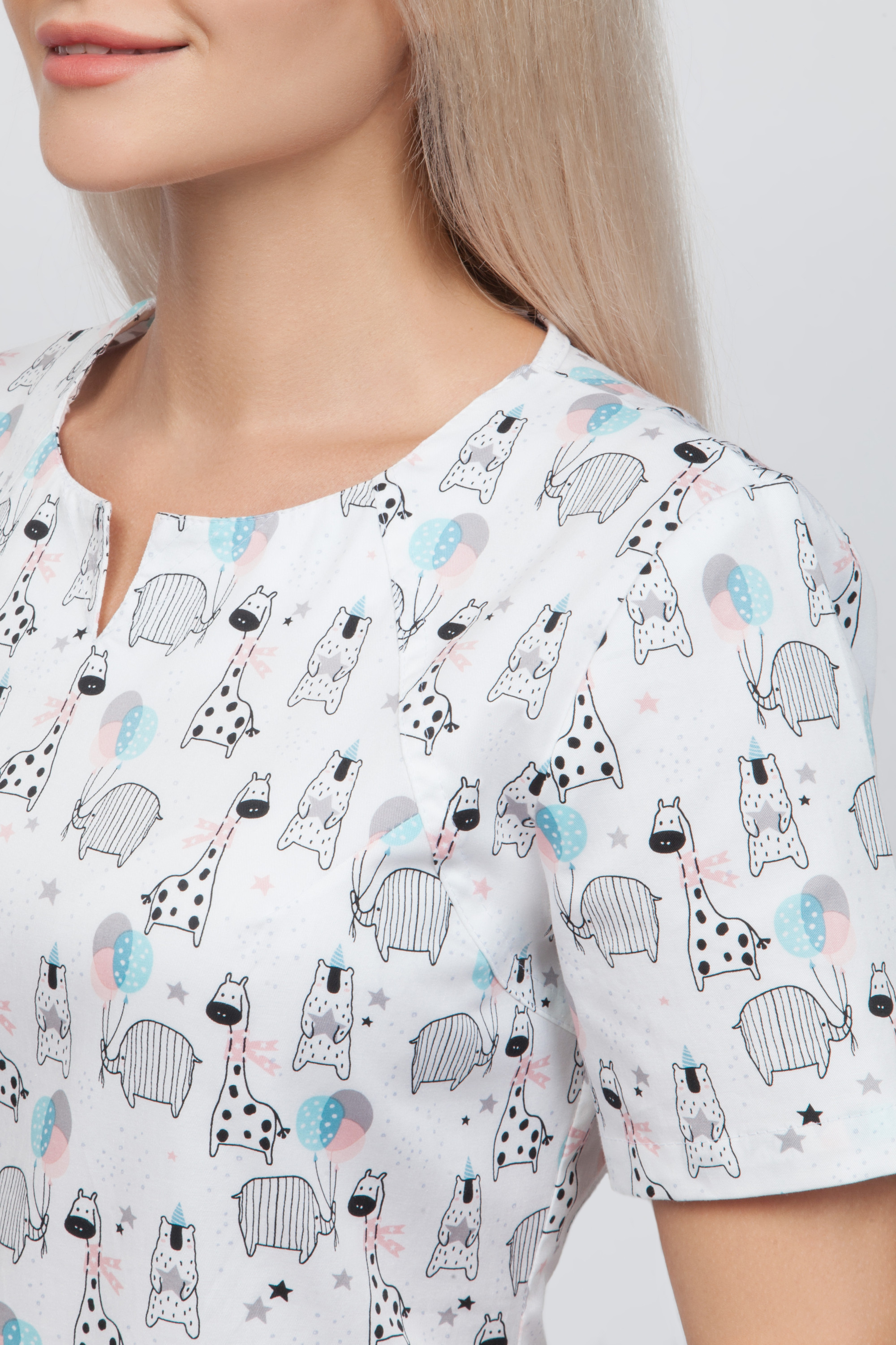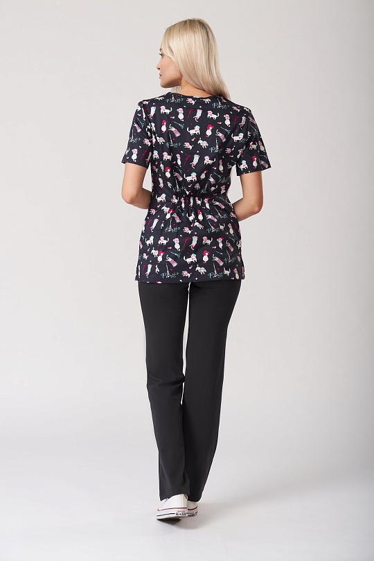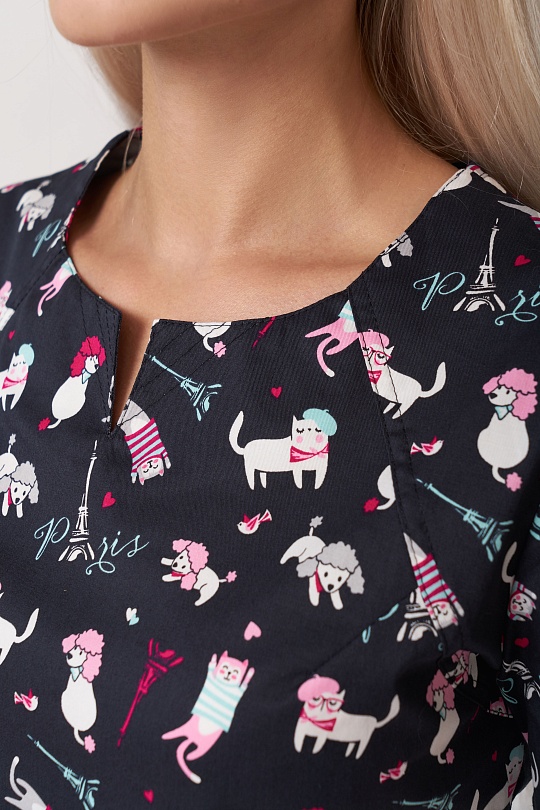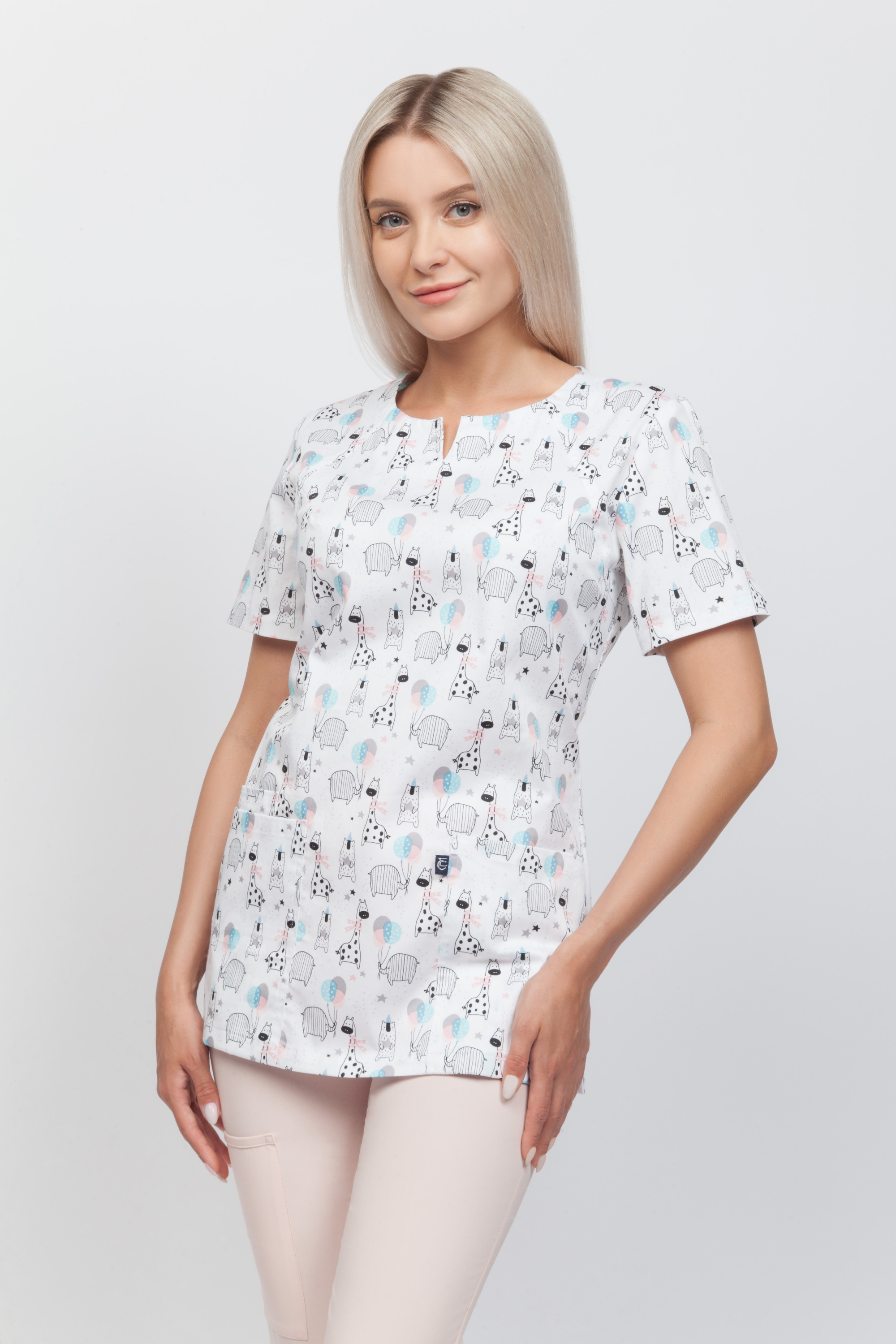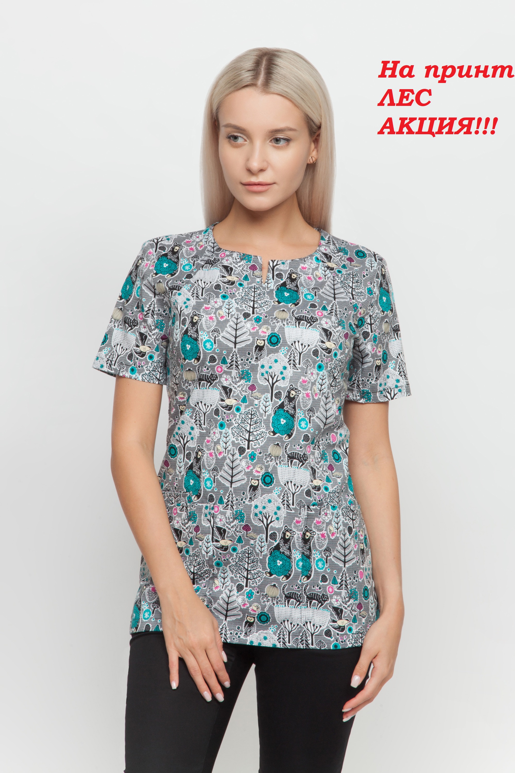 Куртка женская медицинская, хирургическая, прямого силуэта, без воротника и застежки, с разрезами в боковых швах. Перед с фигурной кокеткой, накладными нижними боковыми карманами, нагрудной выточкой, выходящей из кокетки. На правой стороне над карманом, расположен малый карман. Горловина закругленная с фигурным вырезом и отделочными строчками. Спинка с рельефными швами выходящими из проймы до низа. На центральной части спинки по линии талии на многоигольной с/машине проложены четыре строчки ниткой-резинкой Рукава втачные, одношовные, короткие.