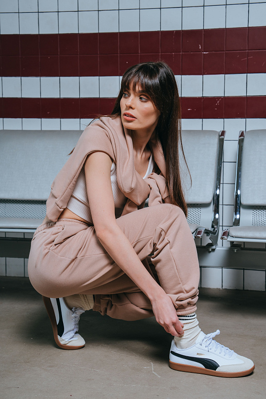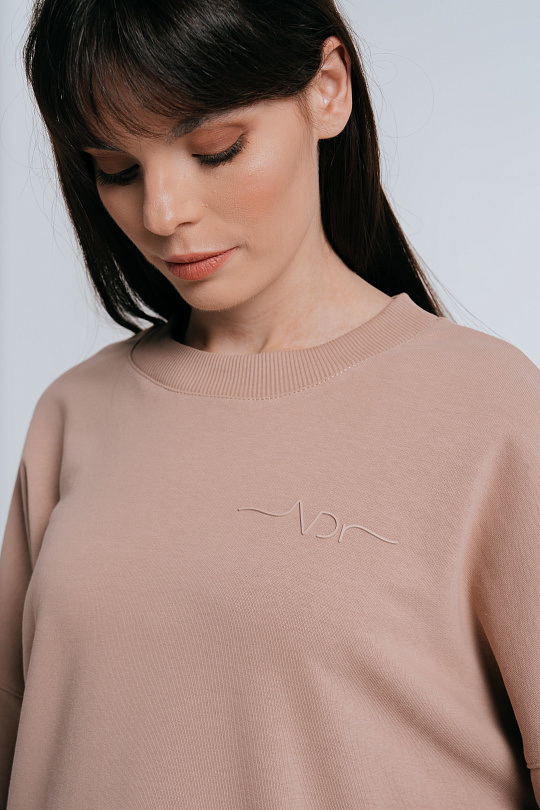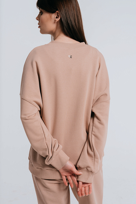 Свитшот женский, прямого силуэта, без воротника, со спущенным плечом. Горловина обработана притачной планкой из эластичной ткани. На полочке декор-флекстран. На спинке пришивной лейбл. Рукава втачные, одношовные, низ рукава на притачной манжете из эластичной ткани. Низ изделия обработан поясом из эластичной ткани.