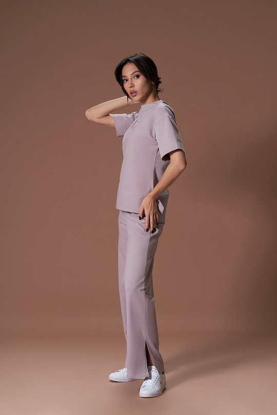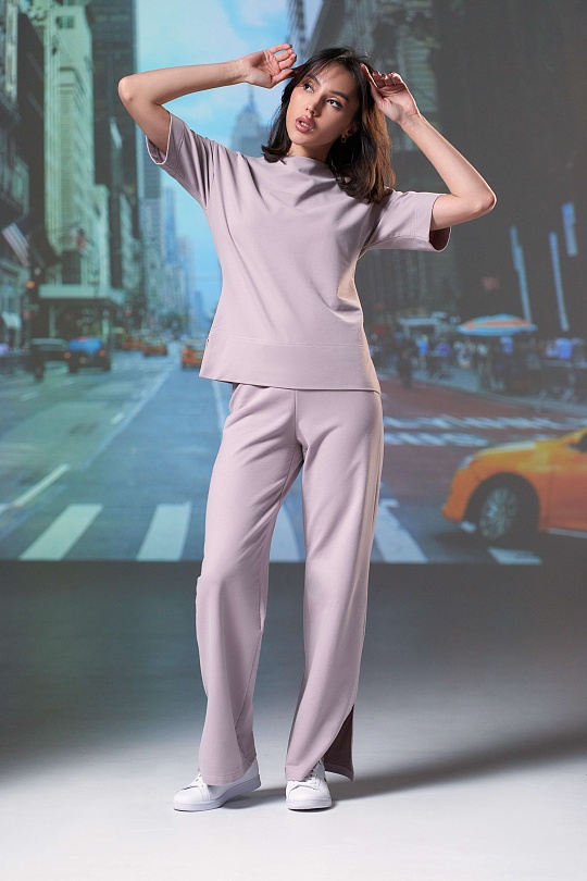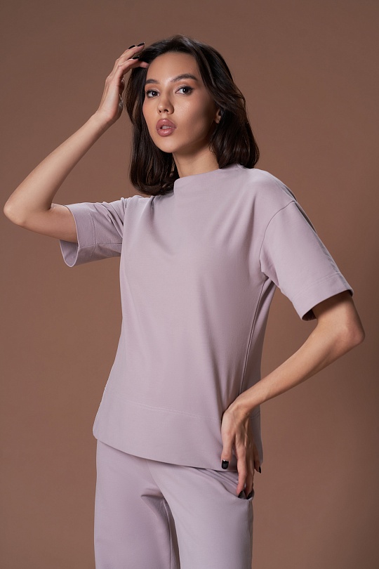 Фуфайка женская, прямого силуэта, с разрезами по бокам, плечо спущенное, рукав втачной. Перед цельный, горловина на обтачке. Спинка цельная, с цельнокроеным воротником стойкой. Рукав втачной одношовный до локтя. Подгибка низа широкая.