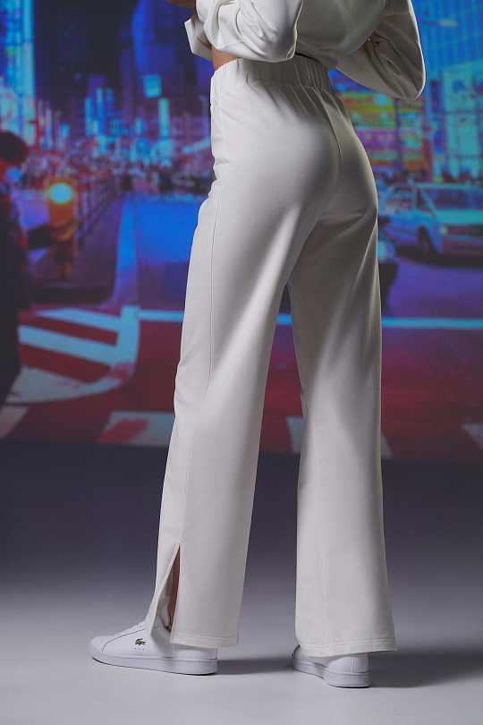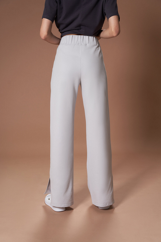 Брюки женские прямые, широкие, с высокими разрезами в боковых швах. Брюки с отрезным поясом, с продернутой эластичной тесьмой, закрепленной с изнаночной стороны.