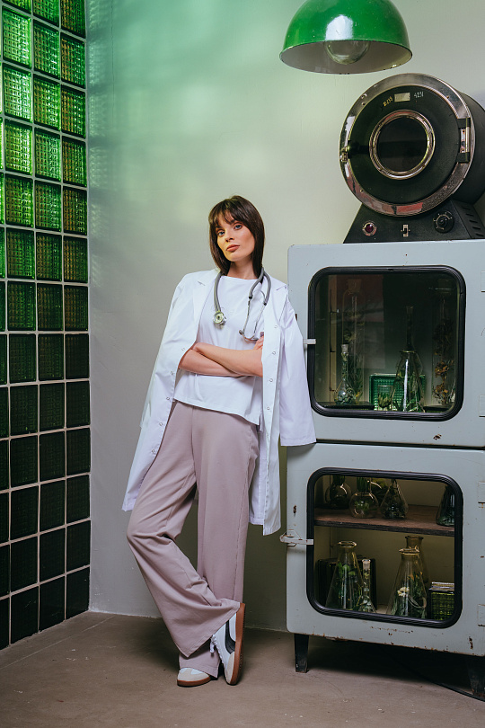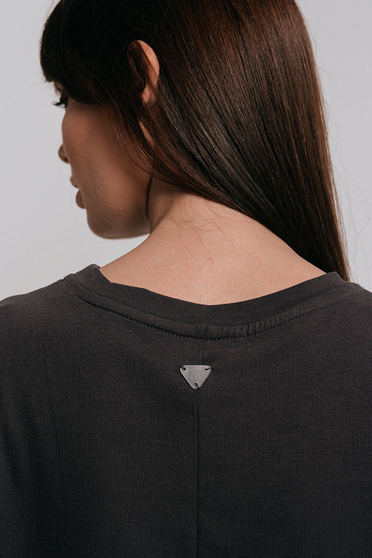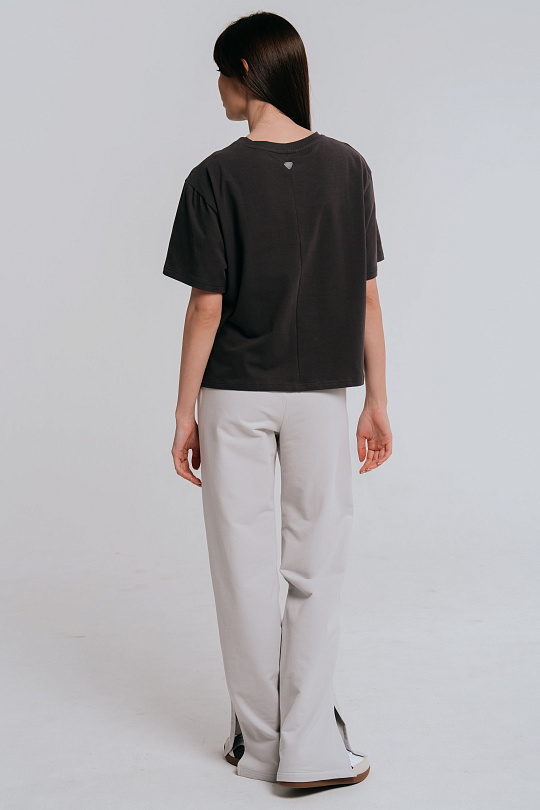 Футболка женская прямого силуэта, с втачным рукавом, с разрезом по боковому шву. Перед цельный, короче спинки на 2 см. Спинка с центральным швом. Рукава втачные, короткие. Вырез горловины обработан планкой.