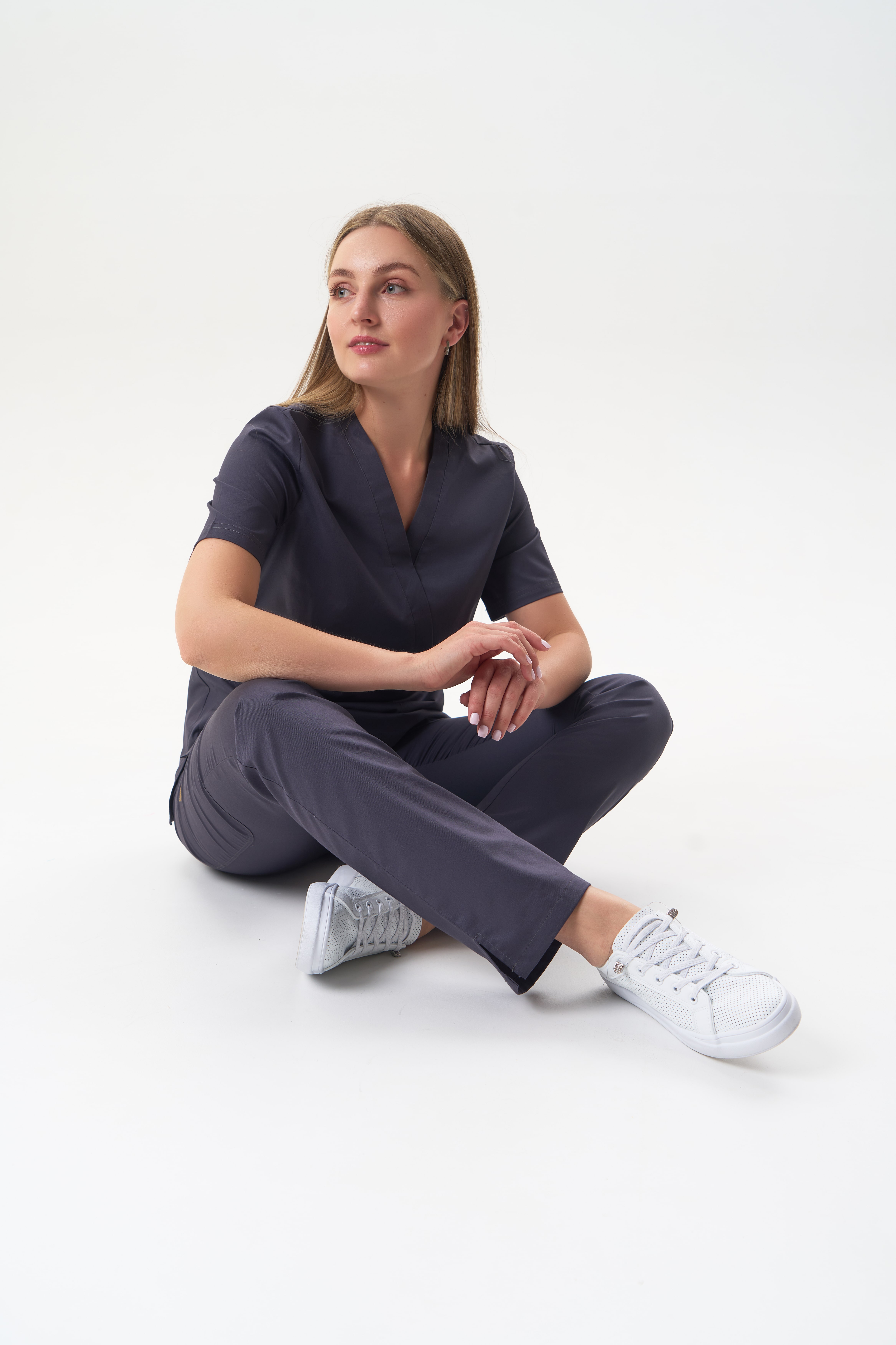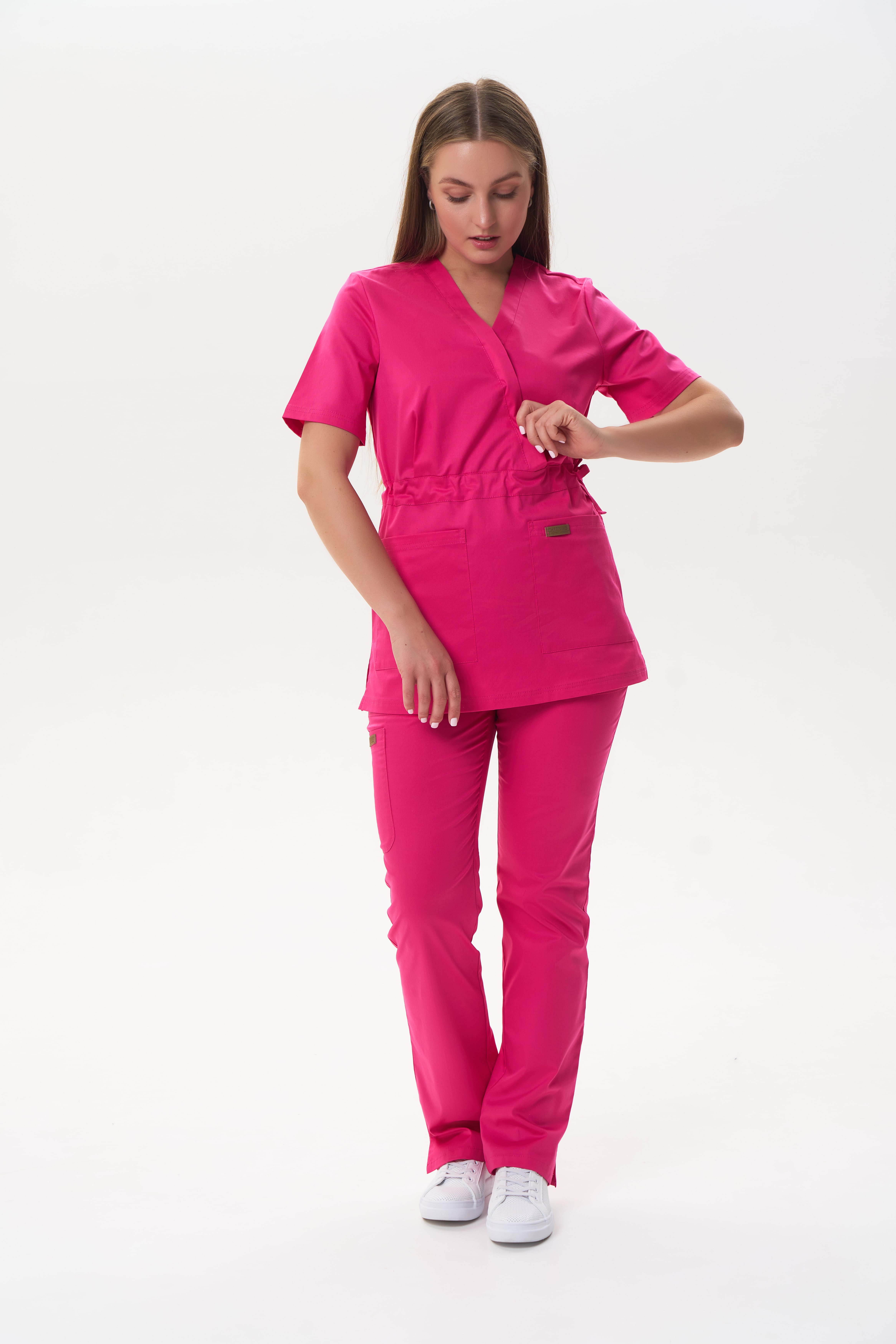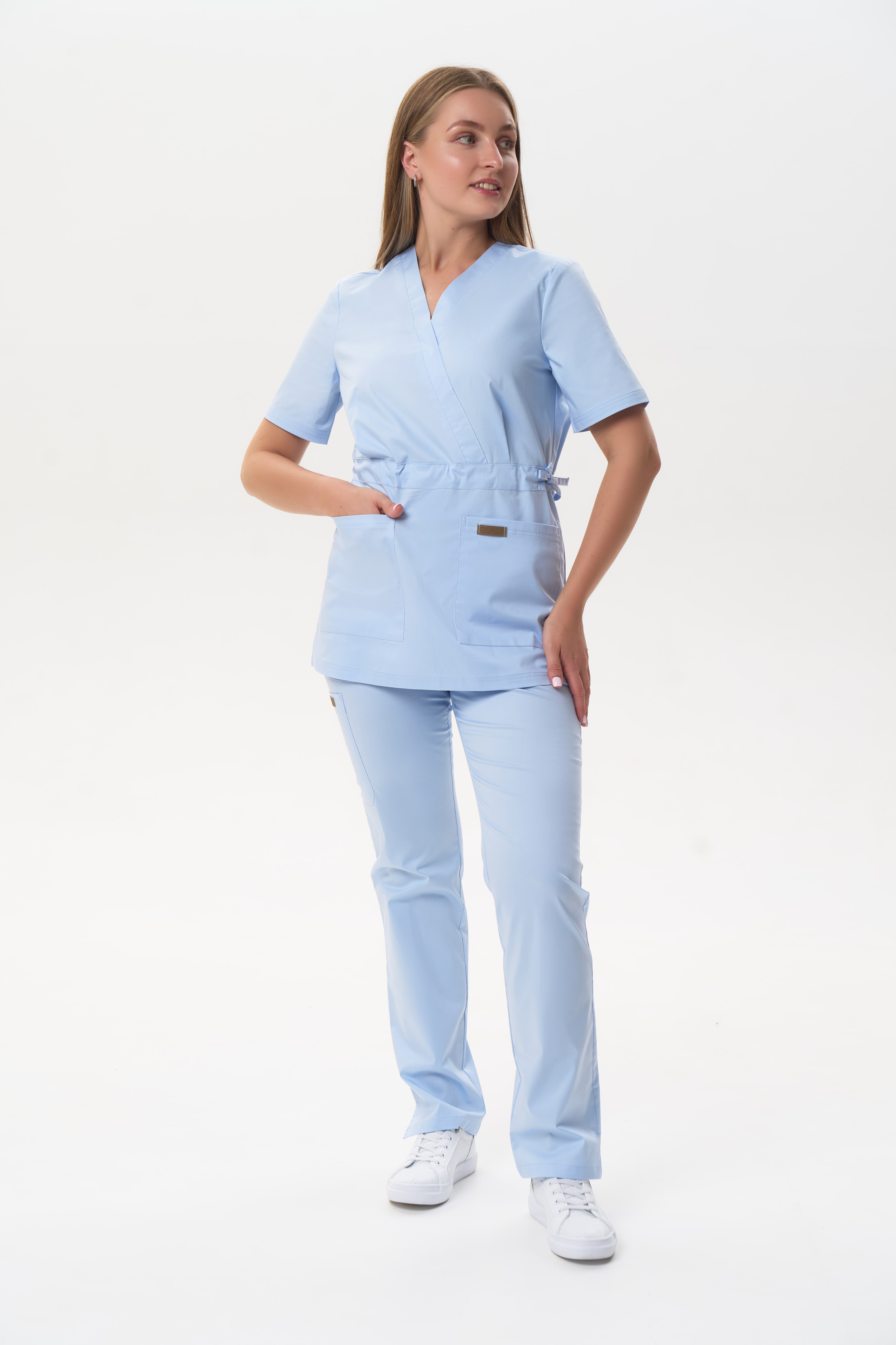 80% терилен, 18% район, 2% спандекс, плотность: 160 г/м. Ткань разрабатывалась специально для медицинской униформы и прекрасно себя зарекомендовала. Приятная на ощупь, мягкая как хлопок, при этом чрезвычайно прочная. Такой ткани не страшны многократные стирки, она хорошо тянется, практически не мнётся, быстро сохнет, отталкивает загрязнение и запахи. Лёгкая и комфортная.
