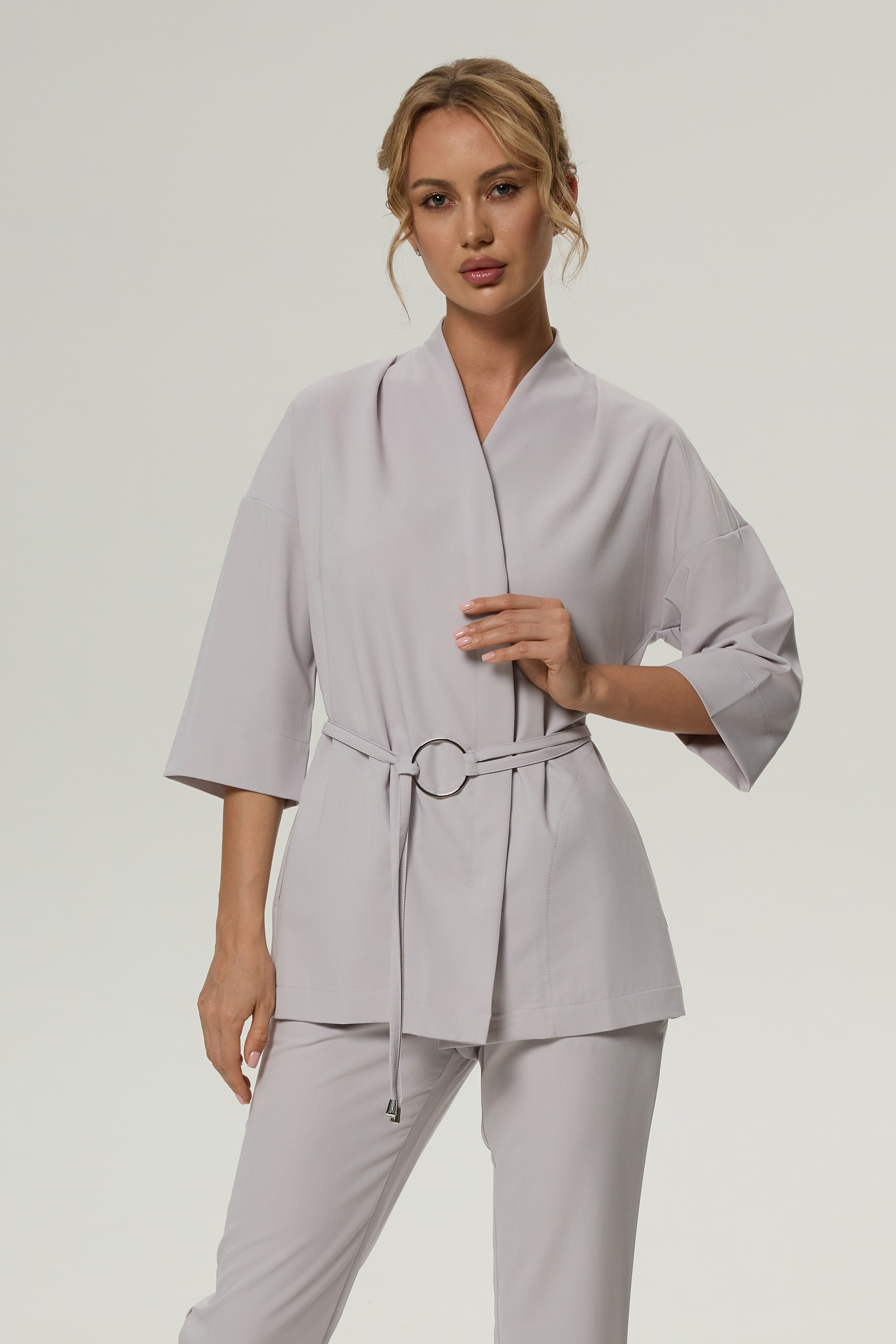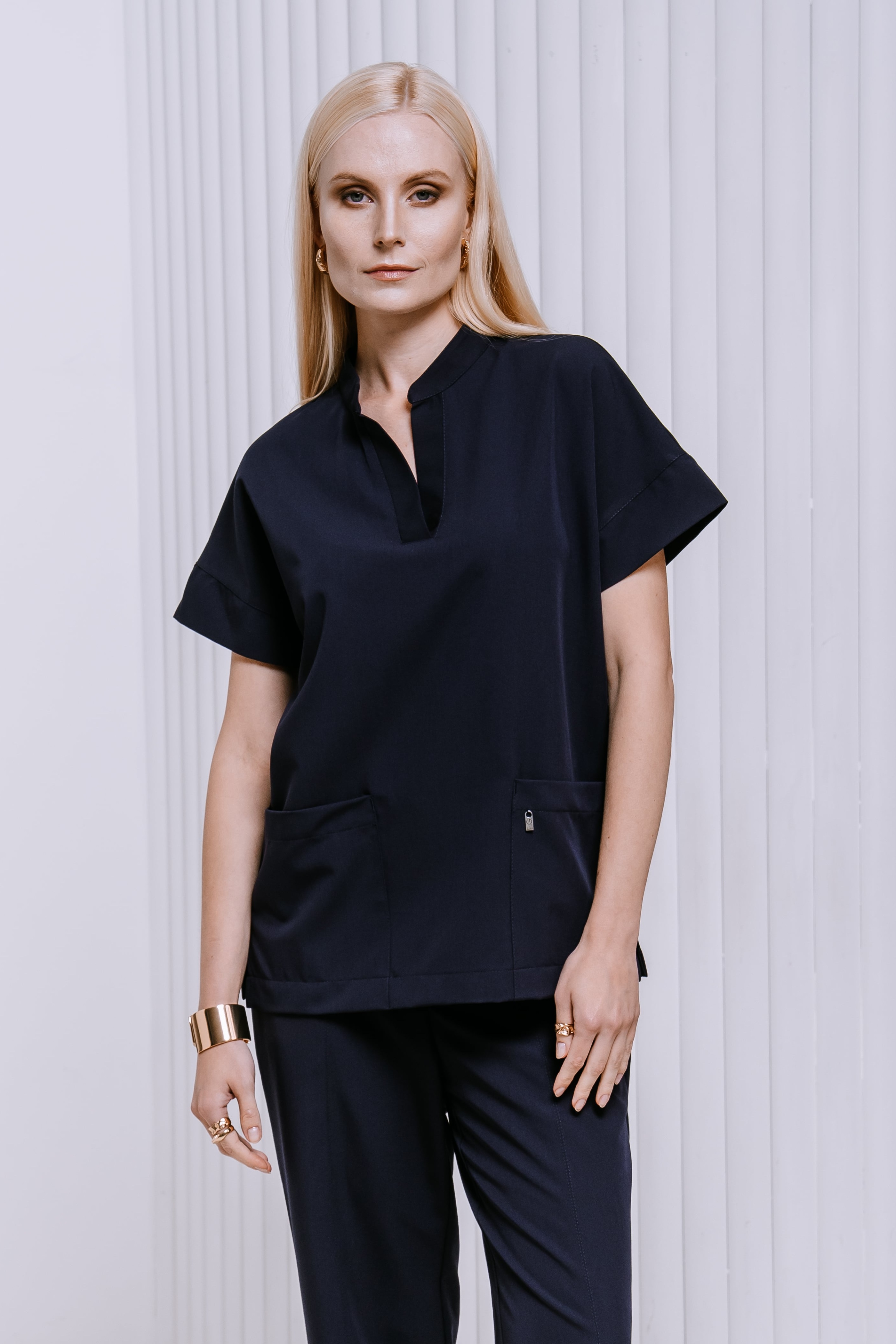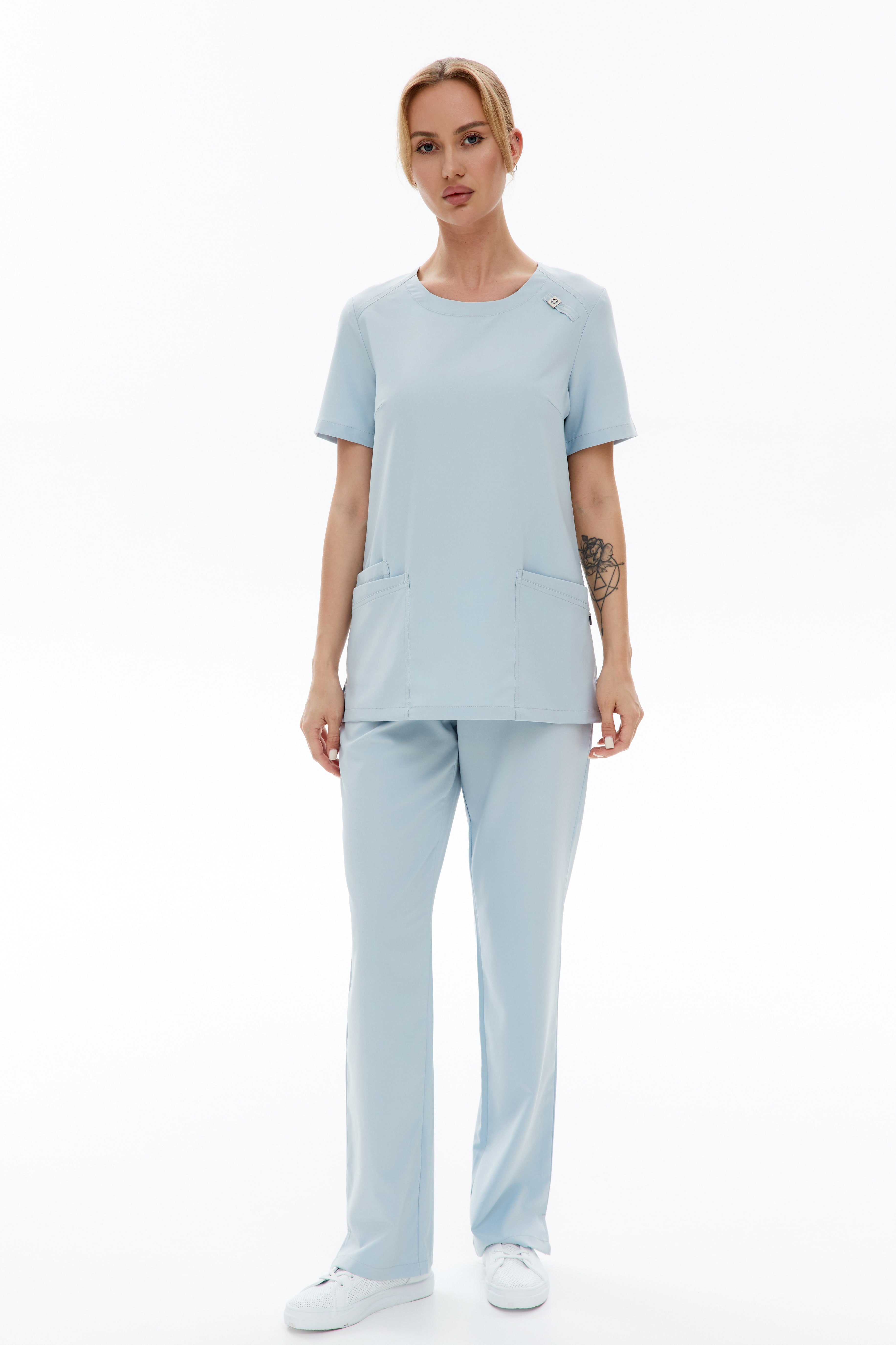 80% терилен, 18% район, 2% спандекс, плотность: 160 г/м. Ткань разрабатывалась специально для медицинской униформы и прекрасно себя зарекомендовала. Приятная на ощупь, мягкая как хлопок, при этом чрезвычайно прочная. Такой ткани не страшны многократные стирки, она хорошо тянется, практически не мнётся, быстро сохнет, отталкивает загрязнение и запахи. Лёгкая и комфортная.